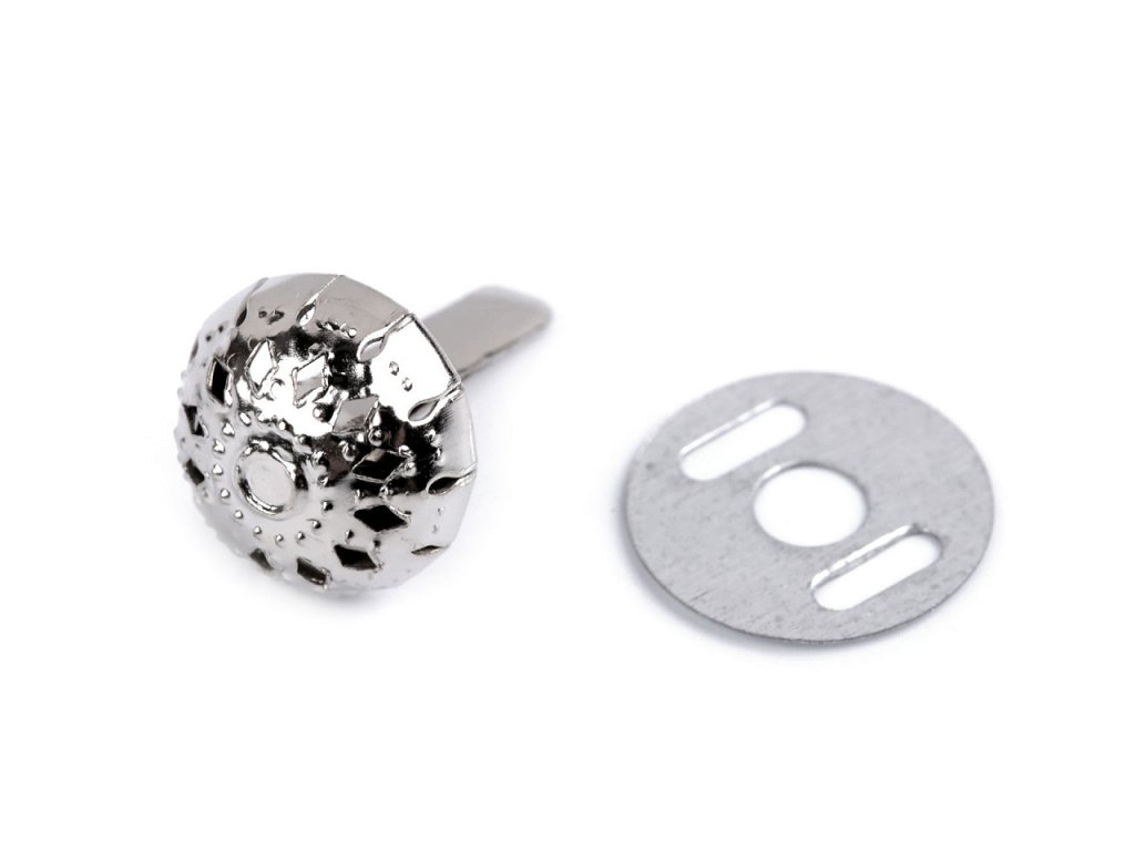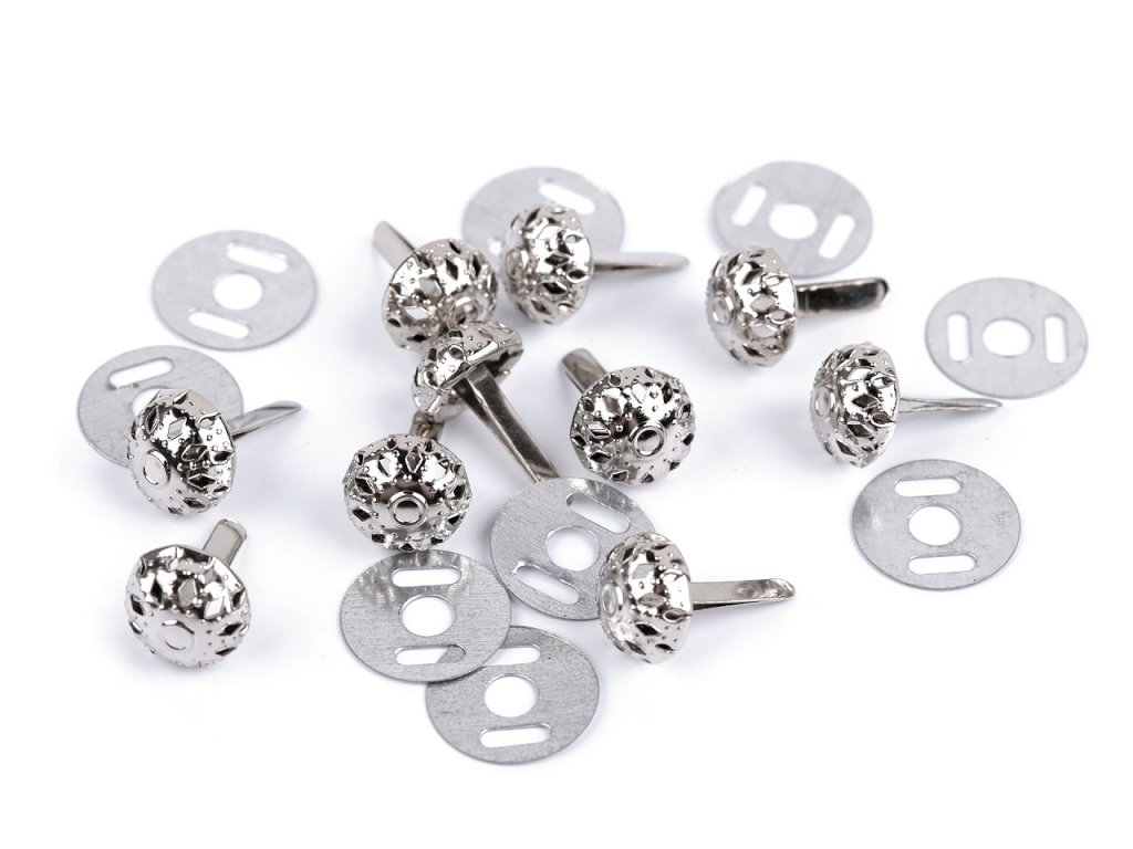 Dvounožkové hřeby s ozdobnou filigránovou hlavičkou využijete jako ochranu dna kabelky, tašky nebo batohu, ale i jako ozdobu (kabelek, tašek, opasků apod.). Hřeb připevníte jednoduše, stačí ho jen vložit do otvoru, přes nožky navléct plíšek a obě nožky hřebu rozevřít do stran. Jedna sada obsahuje 1 hřeb a 1 plíšek. Rozměry č. 1: - délka hřebu: 17 mm - průměr hlavičky: 10 mm - průměr plíšku: 13 mm Rozměry č. 2: - délka hřebu: 19 mm - průměr hlavičky: 12 mm - průměr plíšku: 13 mm- Průměr: č. 1: 10 mm