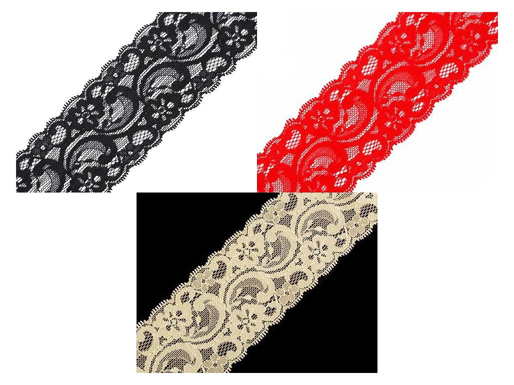 Elastická krajka o šíři 55 mm je vyrobená z kvalitního polyamidu. Díky elastanu je krajka poměrně pružná. Nejčastěji se používá na lemování spodního prádla, lze ji ale použít i na dámská trika, sukně, ke zdobení přání atd. Krajka může mít v návinu 4 až 5 prostřihů. Šíře krajky se po konečné úpravě může lišit o ±6%.- Šíře: 55 mm