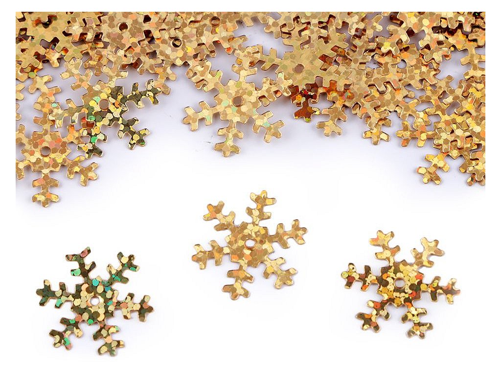 Hladké metalické flitry sněhové vločky. Vyniknou především u vánočních dekorací. Uprostřed mají otvor, jsou vhodné i na našití na oděvy a módní doplňky. Flitry s označením hologram se nádherně třpytí. Použití: Flitry využijete v technice scrapbooking na zdobení foto rámečků, alb, přáníček, pozvánek, krabiček apod. Jsou vhodné také jako ozdoba na adventní věnce, dárky apod. Nasypané na stole budou působivou ozdobou svátečního prostřeného stolu. V 10 g balení je cca 210 kusů vloček.- Průměr: 19 mm