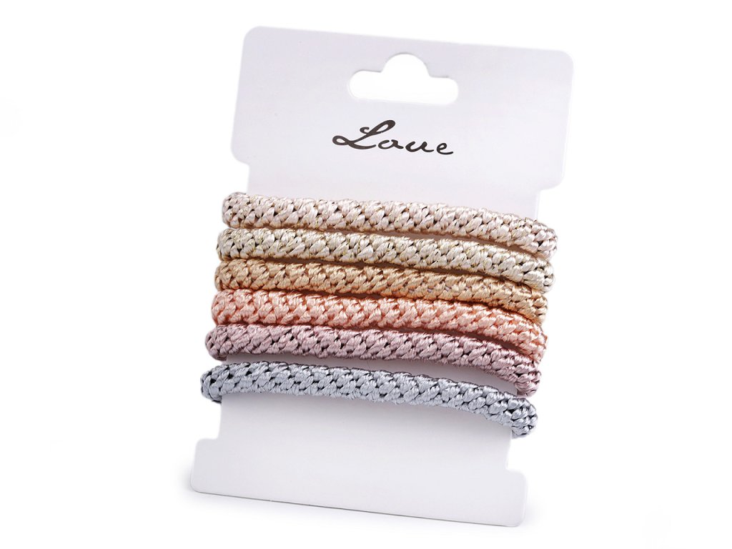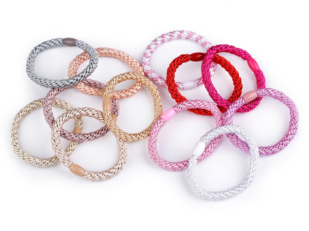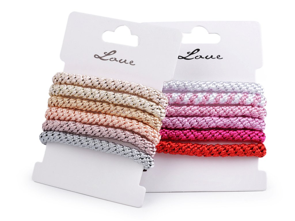Pevné gumičky s pružným spleteným opletem se hodí pro vytvoření pevného účesu. Jsou vhodné i pro hustší vlasy. V zadní části mají plastovou spojku ve tvaru oválného korálku. V jedné sadě je 6 gumiček. Vnitřní průměr gumičky je cca 4,8 cm a maximální délka obvodu po roztažení je cca 24 cm. Gumičky jsou na kartě, která má otvor na zavěšení na prodejní stojan.- Průměr: cca 5,8 cm