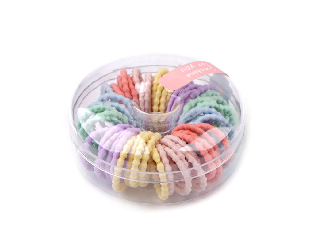 Sada gumiček do vlasů je ideální pro holčičky, které rády vytvářejí zajímavé účesy. Sada obsahuje 60 gumiček. Je uložená v plastovém boxu, který má tvar donutu.- Rozměry boxu: 7 cm