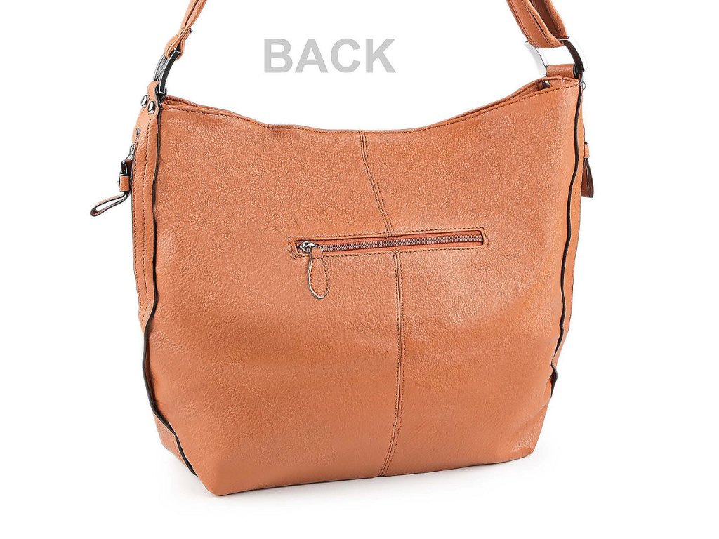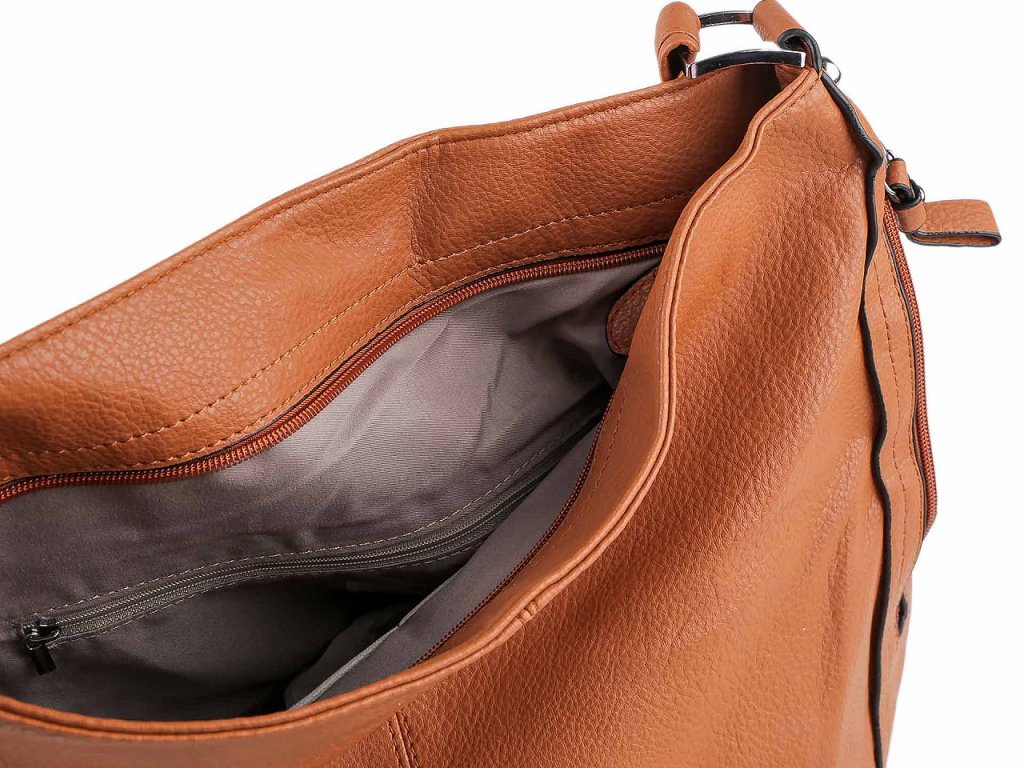 Módní koženková kabelka je uvnitř velmi prostorná, umístíte do ní plno věcí. Uzavírá se na zip a má rozšířené dno. Uvnitř kabelky jsou malé přihrádky na mobilní telefon, klíče či jiné drobnosti a kapsa na zip, která slouží k uschování drobných cenností. Na zadní straně kabelky je další malá kapsa na zip a dvě malé zipové kapsy najdete i po jejích stranách. Kabelka má nastavitelný popruh, který můžete nosit přes rameno nebo jako crossbody do kříže.- Rozměry (ŠxVxH): 42 x 34 x 11 cm