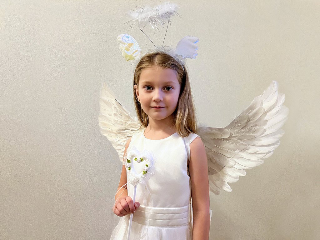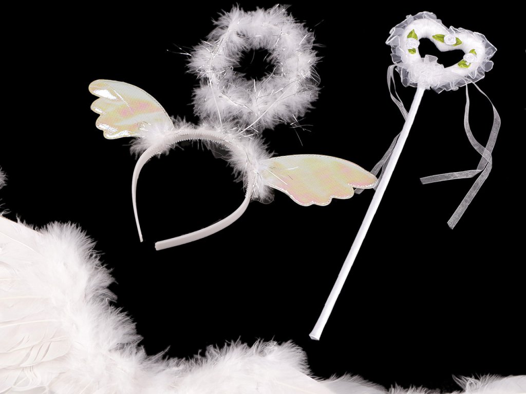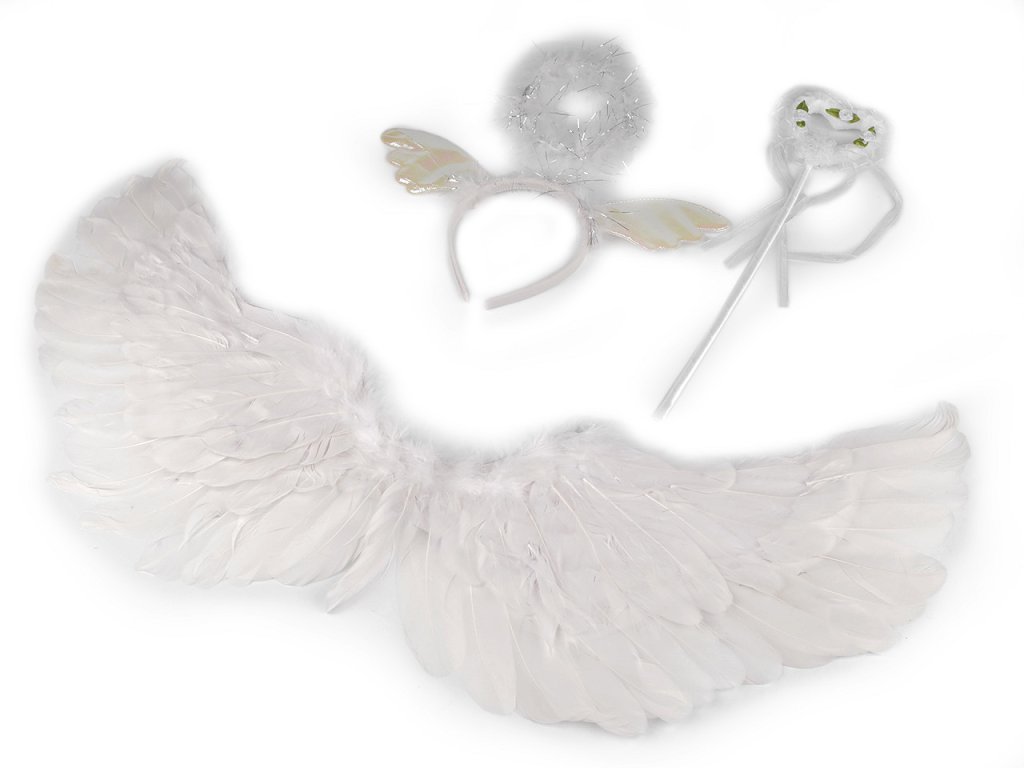 S karnevalovým kostýmem se každá malá holčička promění v roztomilého andílka. Kostým se skládá z péřových křídel, hůlky a čelenky se svatozáří. Křídla jsou oboustranná, bohatě pokrytá peřím, nasazují se pomocí gumiček. Rozměry křídel jsou 40 x 62 cm. Obvod čelenky je 33 cm. Délka hůlky je 38 cm.- Sada: 3 ks