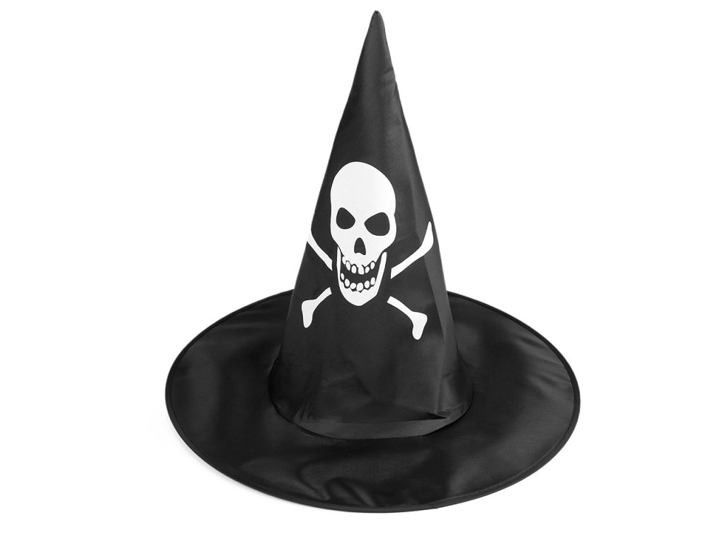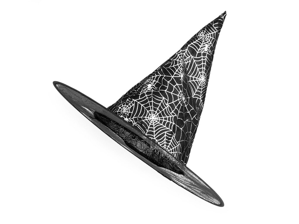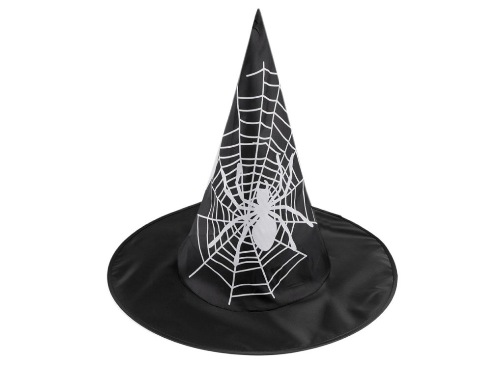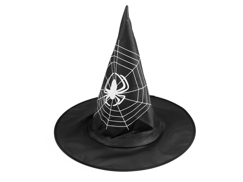 Karnevalový klobouk čarodějnický - pavučina, lebka, netopýr, dýně, čarodějnice