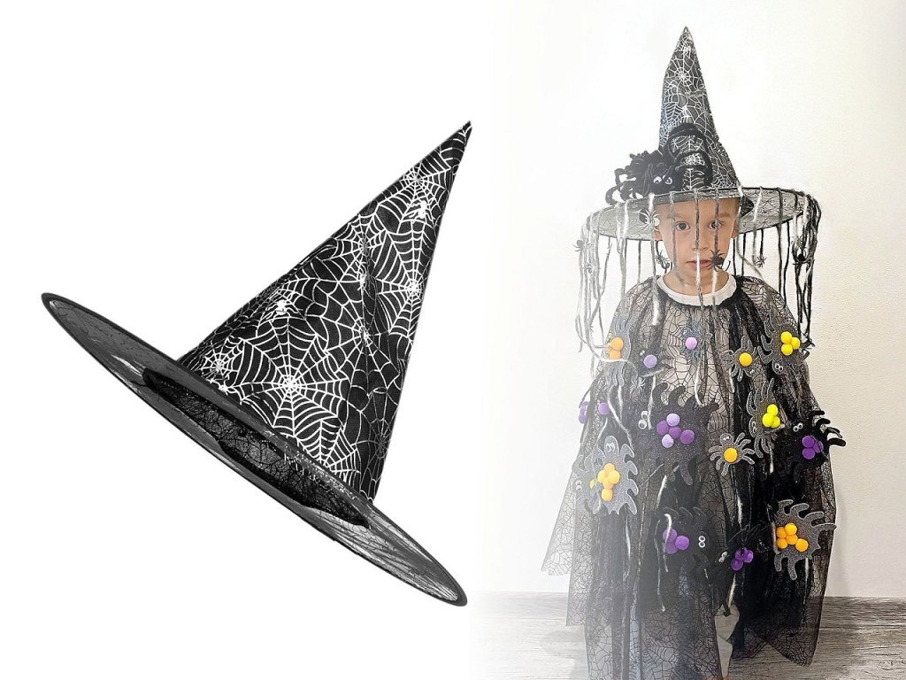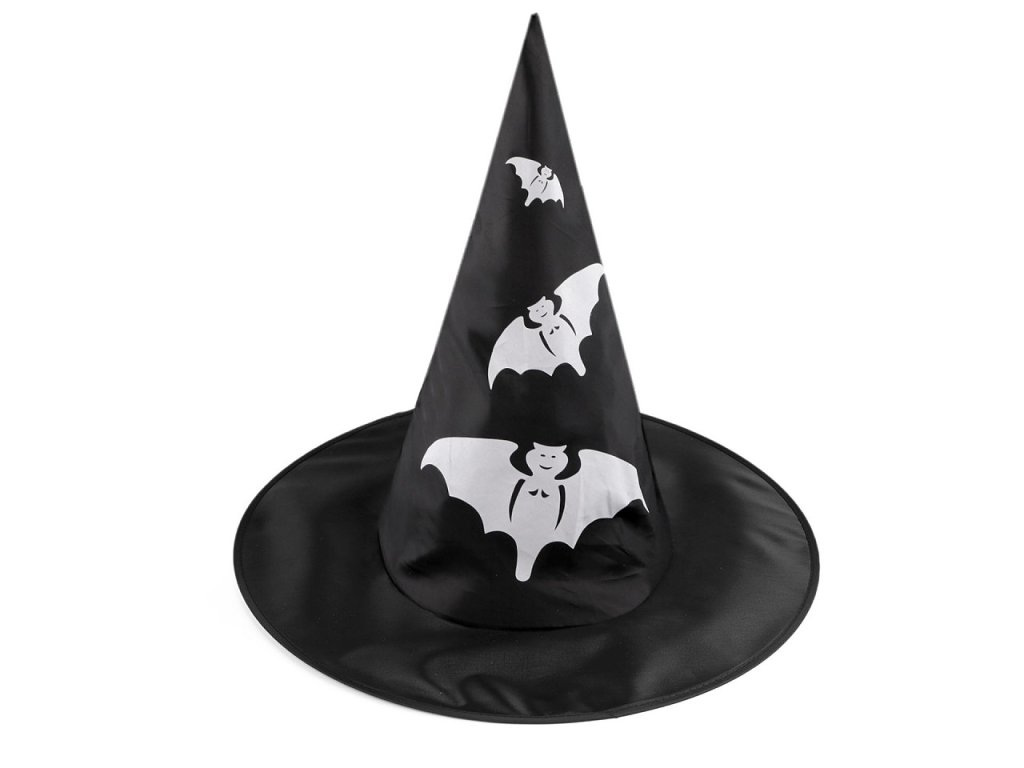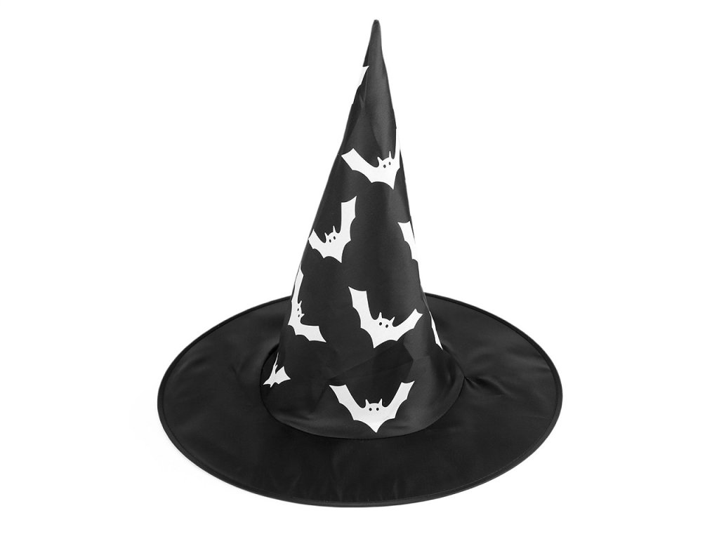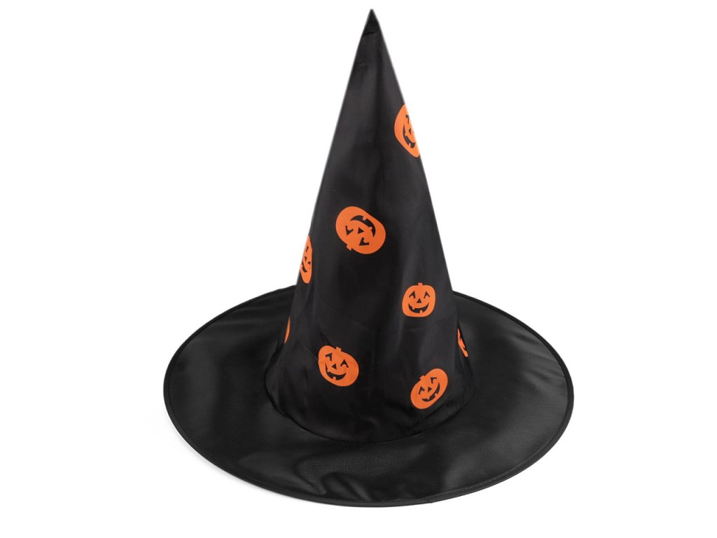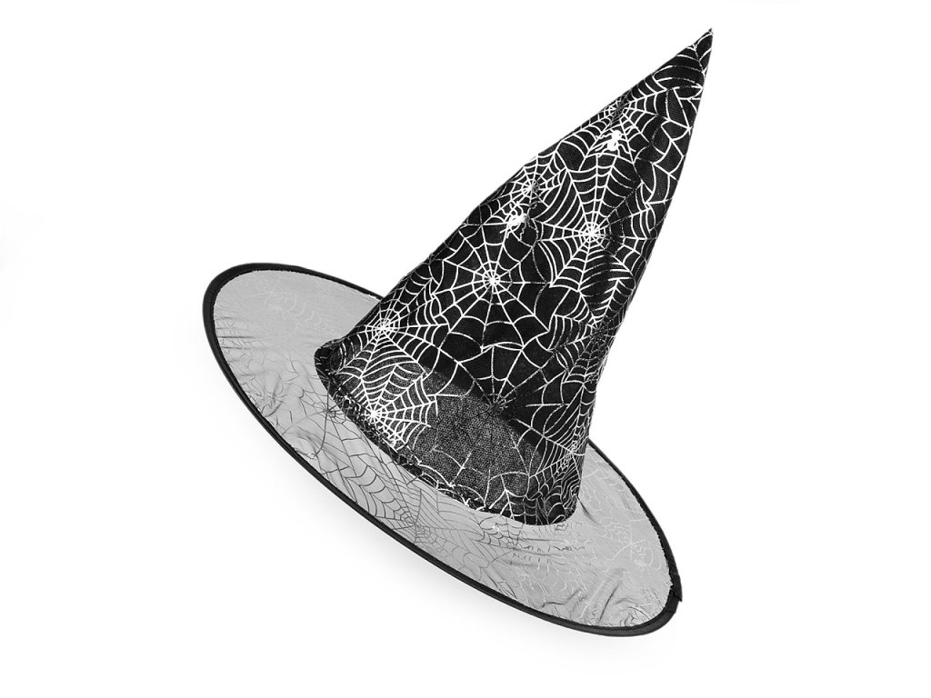 Karnevalový klobouk vás promění v čaroděje nebo čarodějnici. Dobře drží tvar, je z neprůhledné polyesterové tkaniny. Nahoře na přední straně má potisk. Můžete si ho dozdobit dle vlastního vkusu a fantazie. Šířka krempy je 9 cm. Klobouk č.1 má metalický potisk pavučin na celé ploše klobouku, krempu má průsvitnou.- Obvod: 60 cm