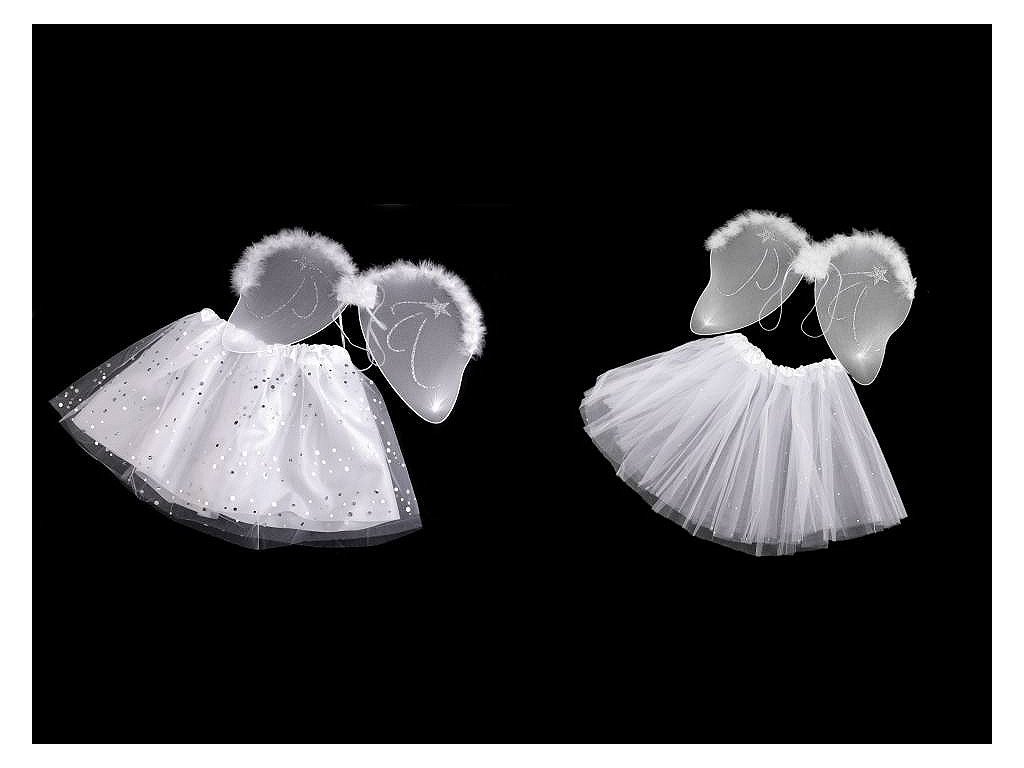S karnevalovou sadou proměníte svou malou holčičku v anděla. Kostým anděla se skládá z tylové sukýnky a křídel, která jsou vyztužená a nasazují se pomocí gumiček. Rozměry křídel jsou 32 x 43 cm, délka sukně je 32 cm, obvod pasu je 48 - 80 cm.- Sada: 2 ks
