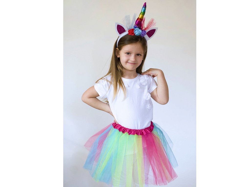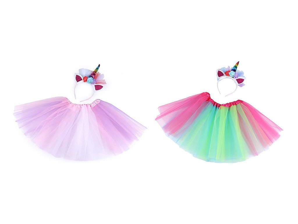 Originální kostým jednorožce si zamilují všechny malé slečny. Kostým se skládá z tylové sukýnky a čelenky, na které je duhový roh, uši s glitry a pěnové květy. Délka sukně je cca 27 cm. Obvod 38 - 80 cm. Obvod čelenky je 34 cm. Barva růžiček a čelenky se může lehce lišit. Barva sukýnek u varianty č. 2 se může mírně lišit.- Sada: 2 ks