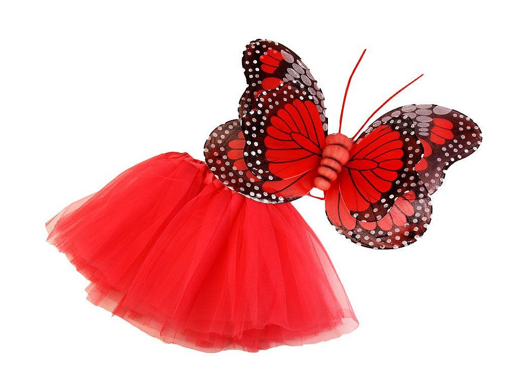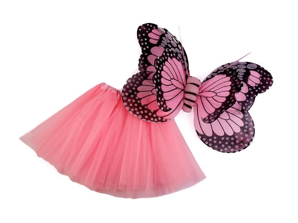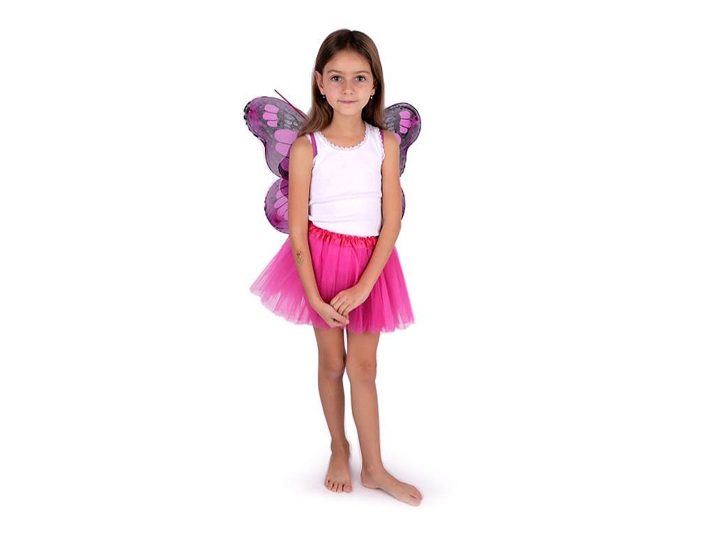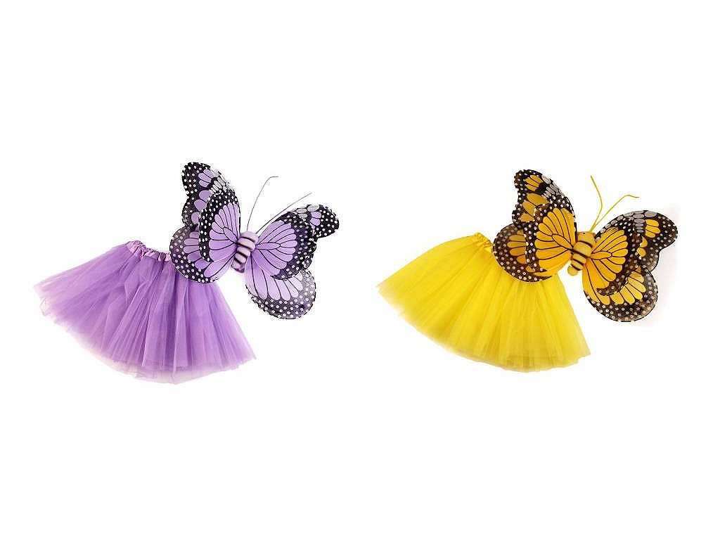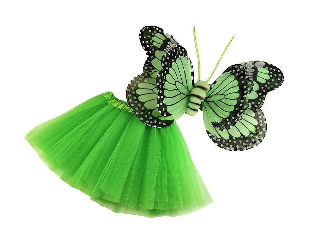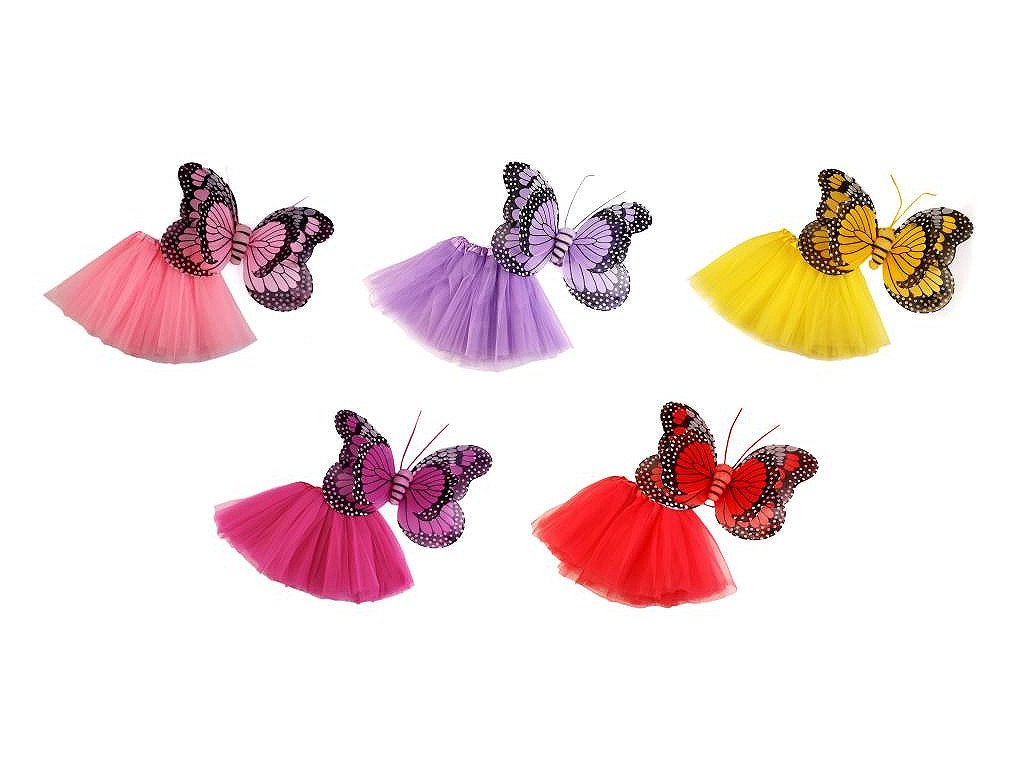 S karnevalovou sadou se každá malá slečna promění v motýla. Kostým se skládá z tylové sukýnky a křídel, která jsou dvojitá, vyztužená a nasazují se pomocí gumiček. Rozměry křídel jsou 37 x 48 cm. Délka sukně je cca 27 cm. Obvod 40 - 80 cm. Odstíny sukýnek se mohou lišit, na některých jsou flitry. Barva peříčka u č. 7 se může lišit.- Sada: 2 ks