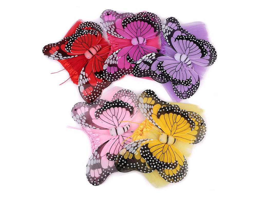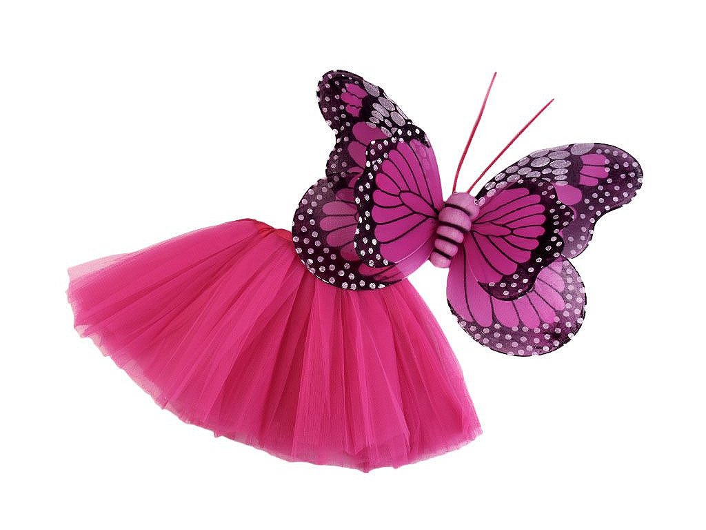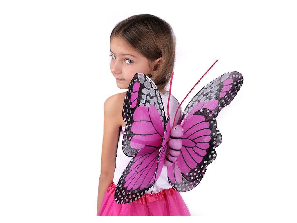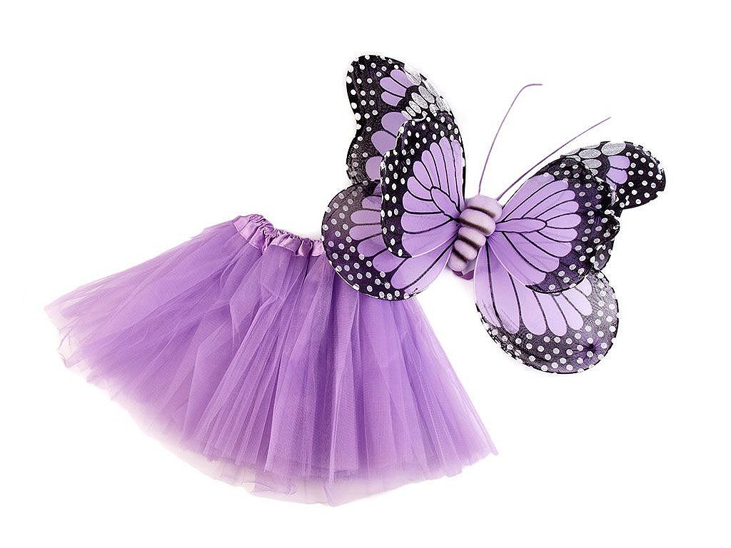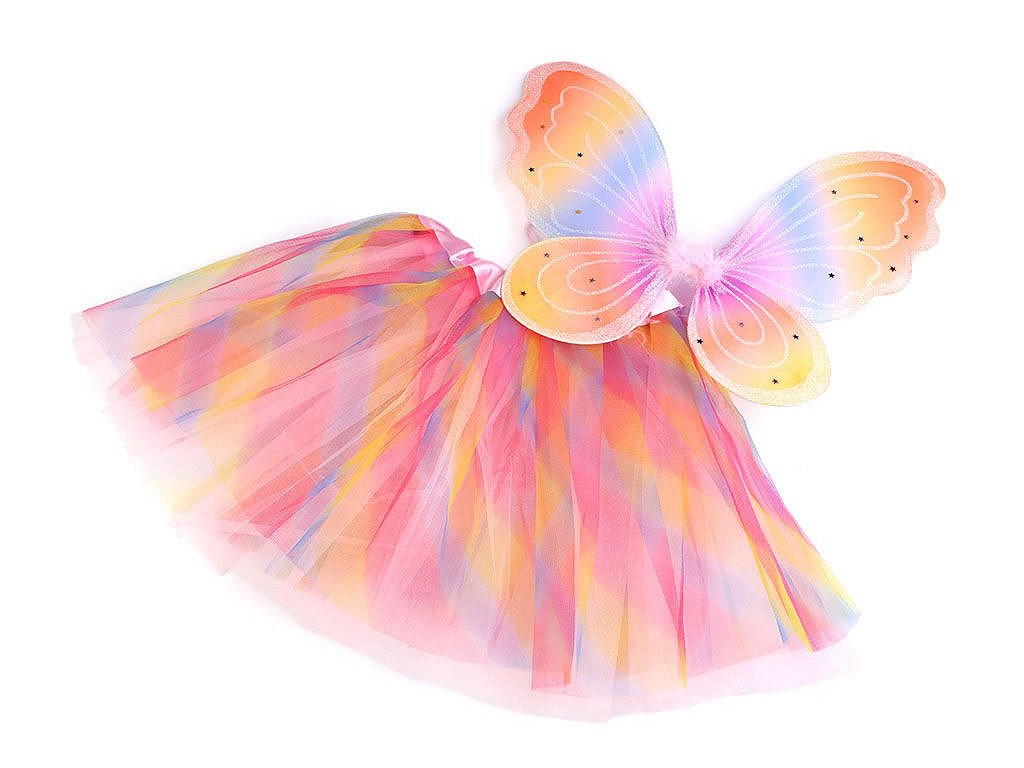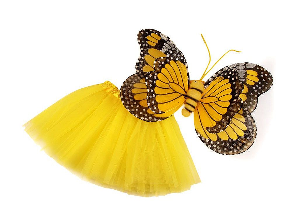 S karnevalovou sadou se každá malá slečna promění v motýla. Kostým se skládá z tylové sukýnky a křídel, která jsou dvojitá, vyztužená a nasazují se pomocí gumiček. Rozměry křídel jsou 37 x 48 cm. Délka sukně je cca 27 cm. Obvod 40 - 80 cm. Odstíny sukýnek se mohou lišit, na některých jsou flitry. Barva peříčka u č. 7 se může lišit.- Sada: 2 ks