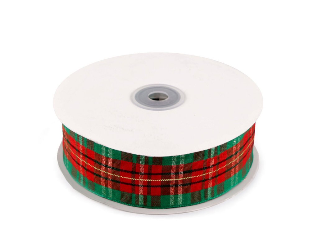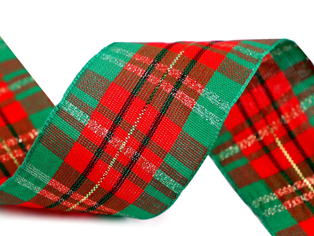 Károvaná stuha má vetkaný lurex, díky kterému se poutavě třpytí. Je oboustranná a pevná, nemá drátek. Použití: můžete ji použít k aranžování věnců, vánočních dekorací, hodí se k ozdobnému balení dárků.- Šíře: 38 mm