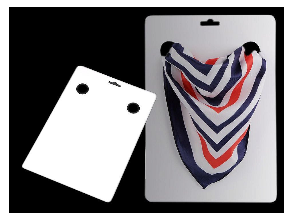 Velká závěsná karta se používá pro úhledné vystavení nebo zabalení šátků. Je z pevného křídového papíru, nahoře má 2 otvory na protažení šátku a 1 otvor pro zavěšení na prodejní stojan.- Rozměry: 21 x 29,7 cm