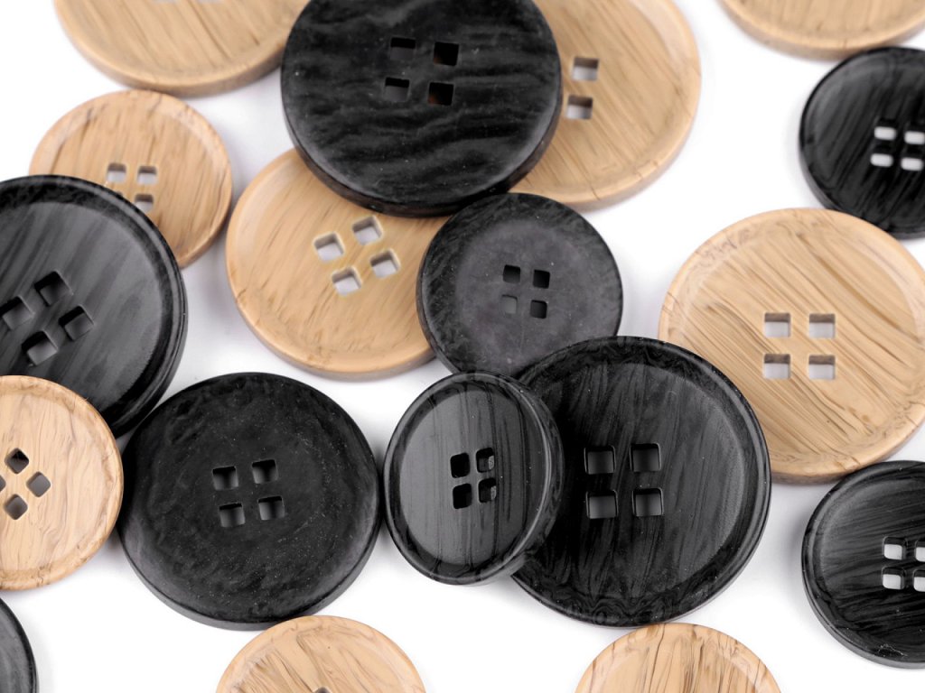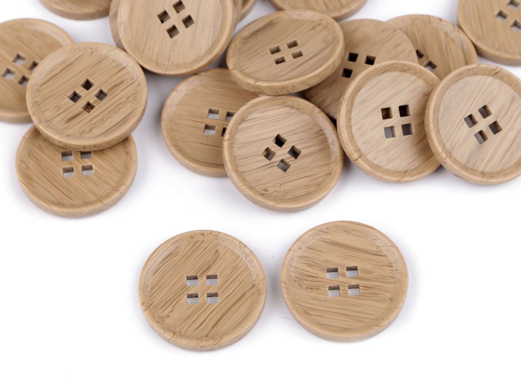 Čtyřdírkové knoflíky mají zesílený okraj a svým zabarvením připomínají strukturu dřeva. Jejich dírky nejsou typicky kulaté, ale mají tvar čtverce. Knoflíky vyniknou na kabátech, svetrech, vestách, sakách apod. Velikost knoflíků naleznete v této tabulce.- Průměr: 20,4; 25,5; 28 mm