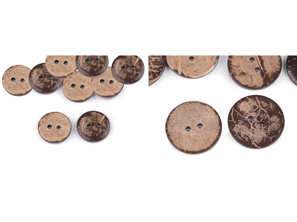 Dvoudírkové knoflíky jsou vyrobené z exotického kokosu. Využijete je jako zapínání na svetry, vesty nebo tašky. Jsou oboustranné. Knoflíky jsou baleny v sáčku. Velikost knoflíků naleznete v této tabulce.- Průměr: 15; 17; 20; 22,8; 25; 30 mm