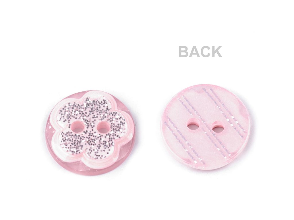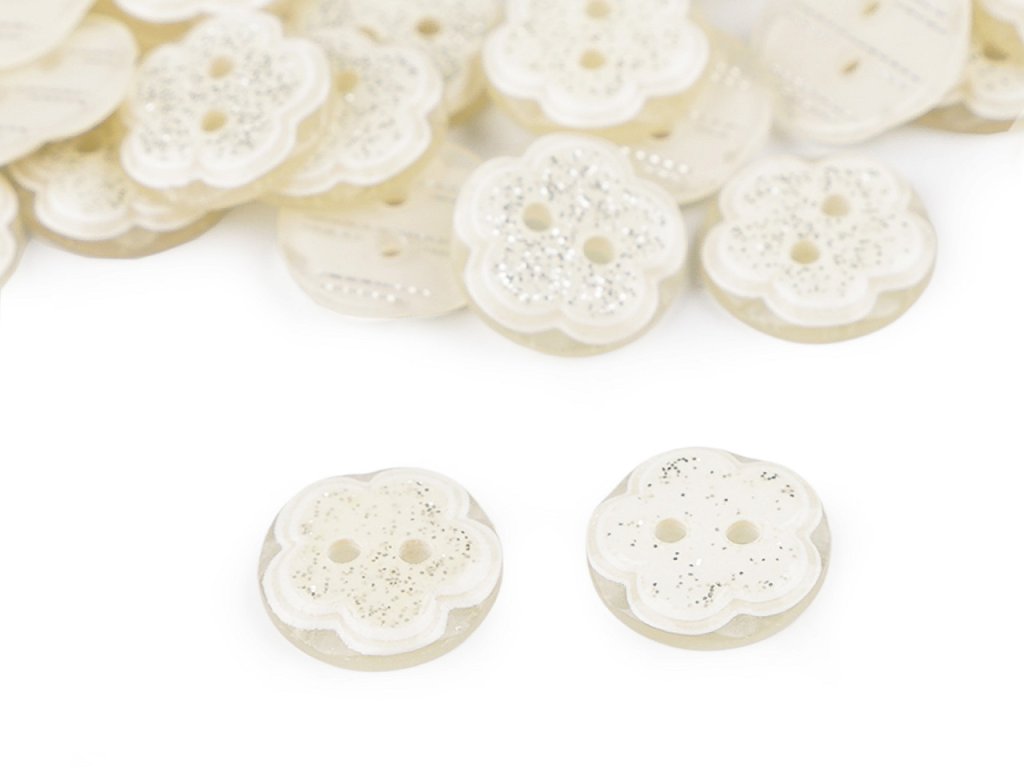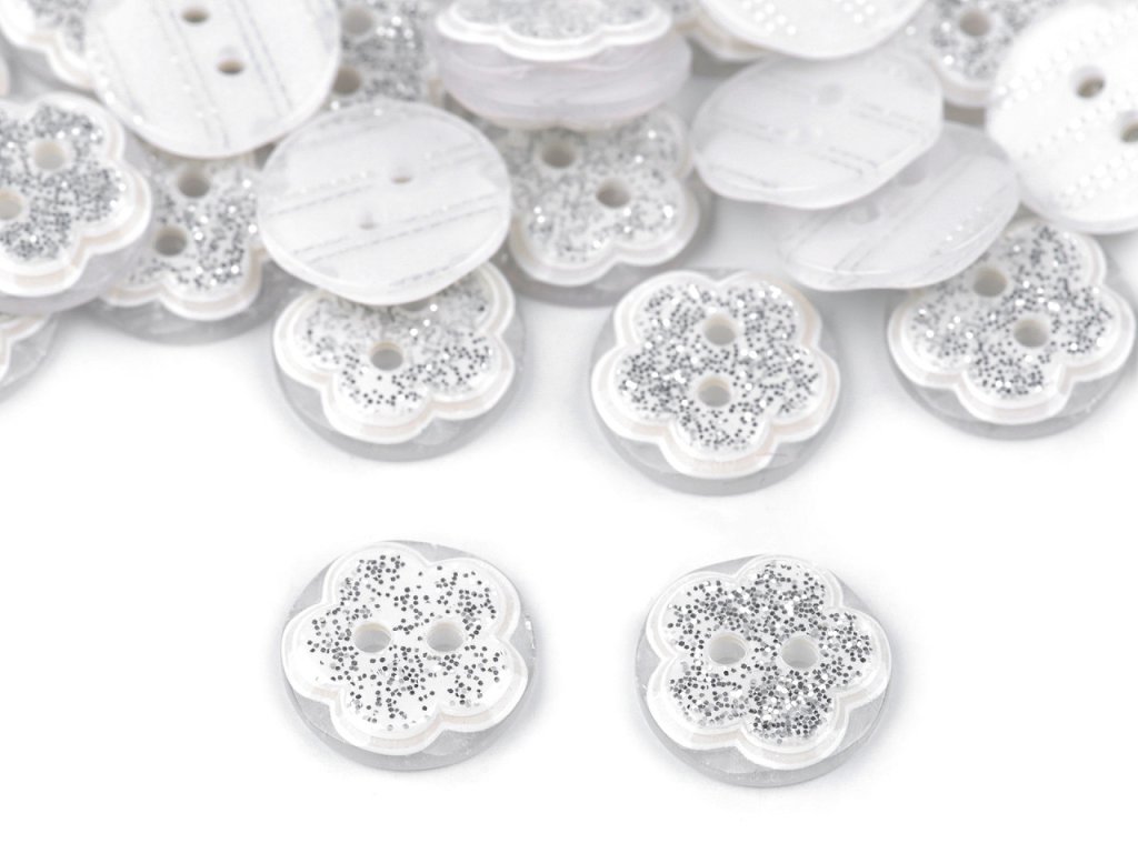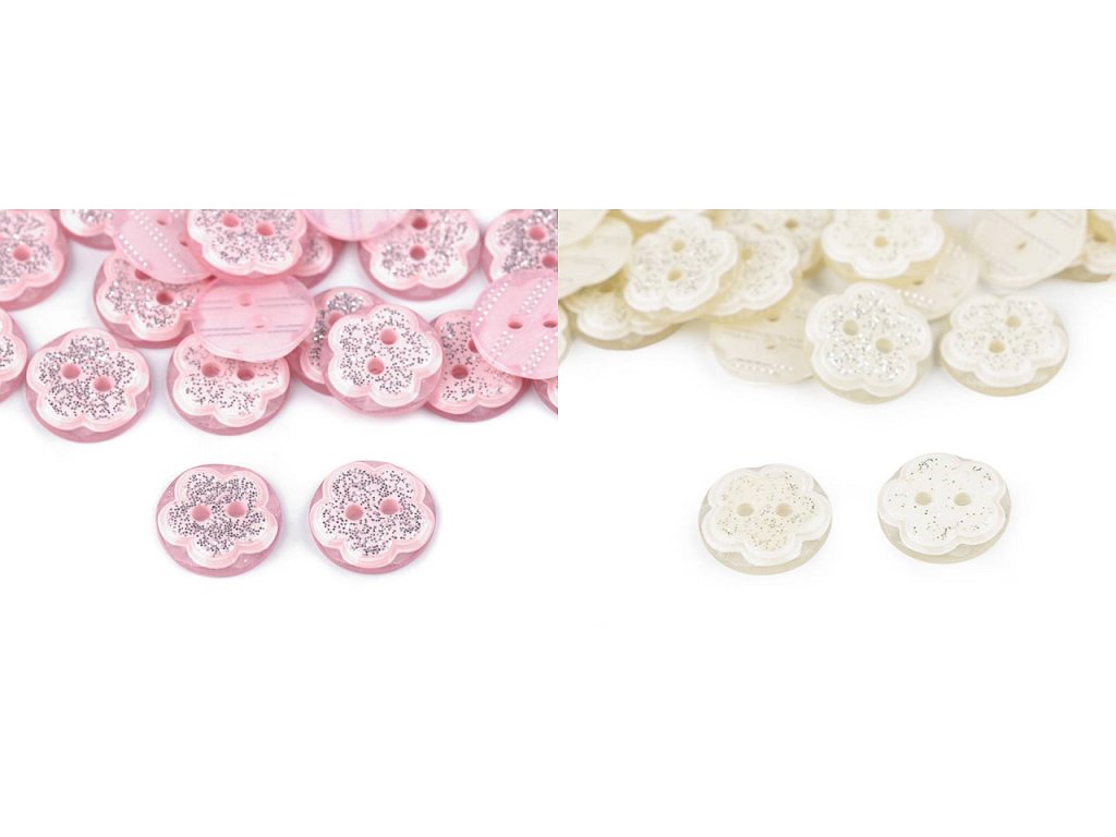 Knoflíky s květem zdobí efektní třpytivé glitry. Ty jsou v knoflíku zafixované, takže nehrozí, že opadají. Knoflíky využijete nejen na oděvy, ale také jimi můžete zkrášlit doplňky jako jsou tašky, čepice, rukavice apod. Jsou vhodné také jako ozdoba k nalepení na foto rámečky, alba, deníky, přáníčka nebo pozvánky. Velikost knoflíků naleznete v této tabulce.- Průměr: 13 mm