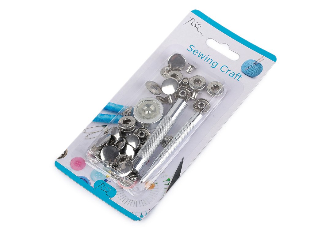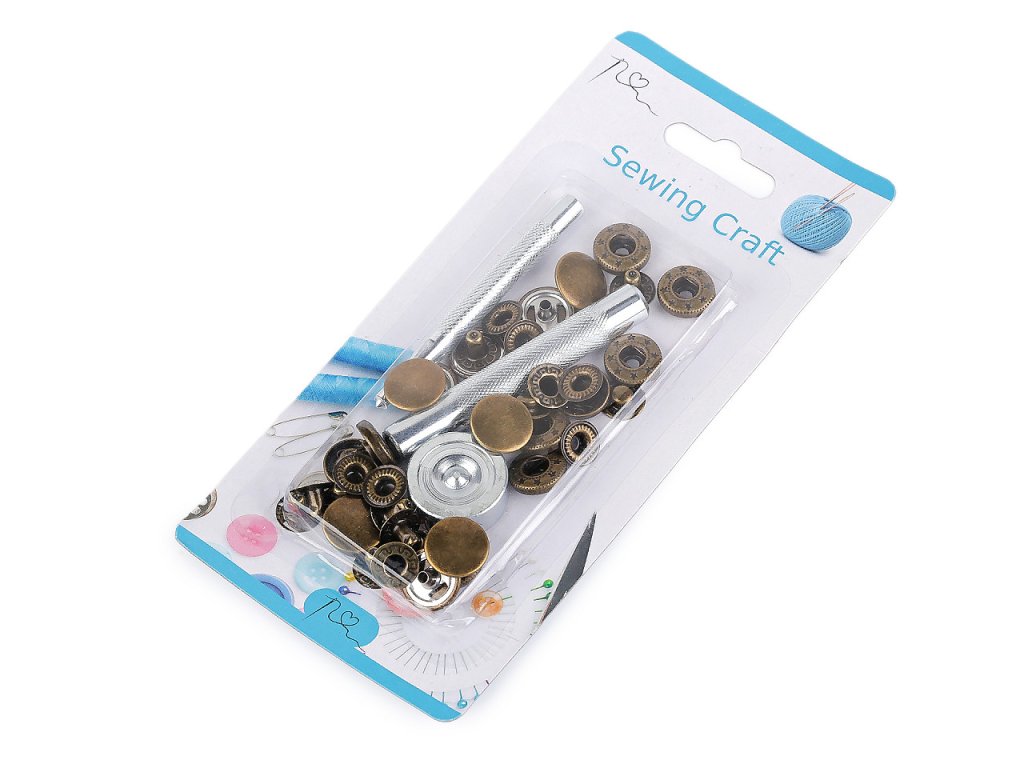 Kovové stiskací knoflíky využijete jako zapínání na doplňky jako jsou tašky, kabelky, batohy apod. K aplikaci vám poslouží razič (délka 7 cm), který je součástí balení. Knoflíky jsou vhodné na středně silné materiály typu koženka, loneta apod. Sada obsahuje 10 ks druků, raziče s kovadlinkou a návod k aplikaci.- Průměr: 15 mm
