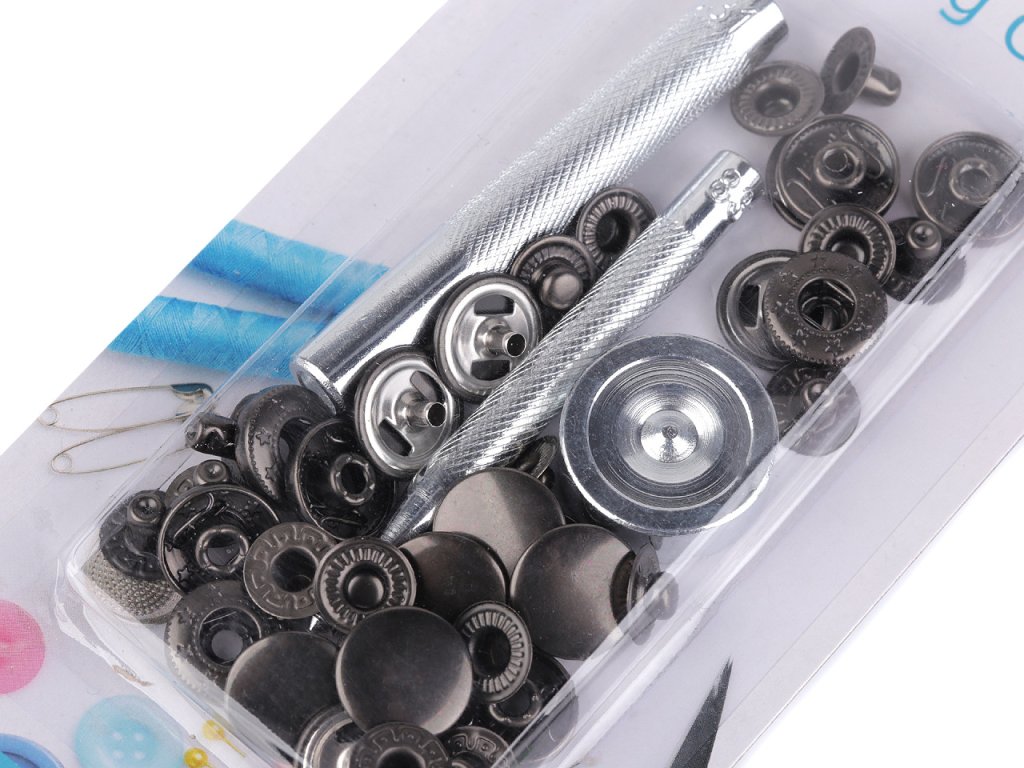 Knoflíky stiskací s pérkem Ø15 mm na středně silné látky, s ručním kovovým aplikátorem