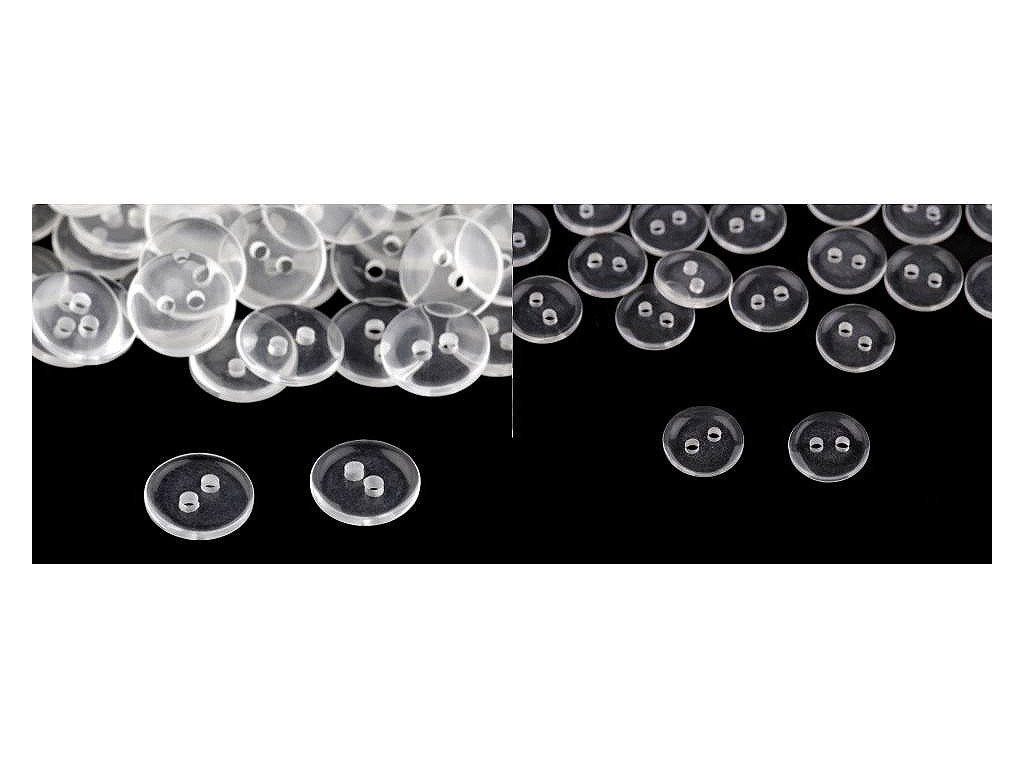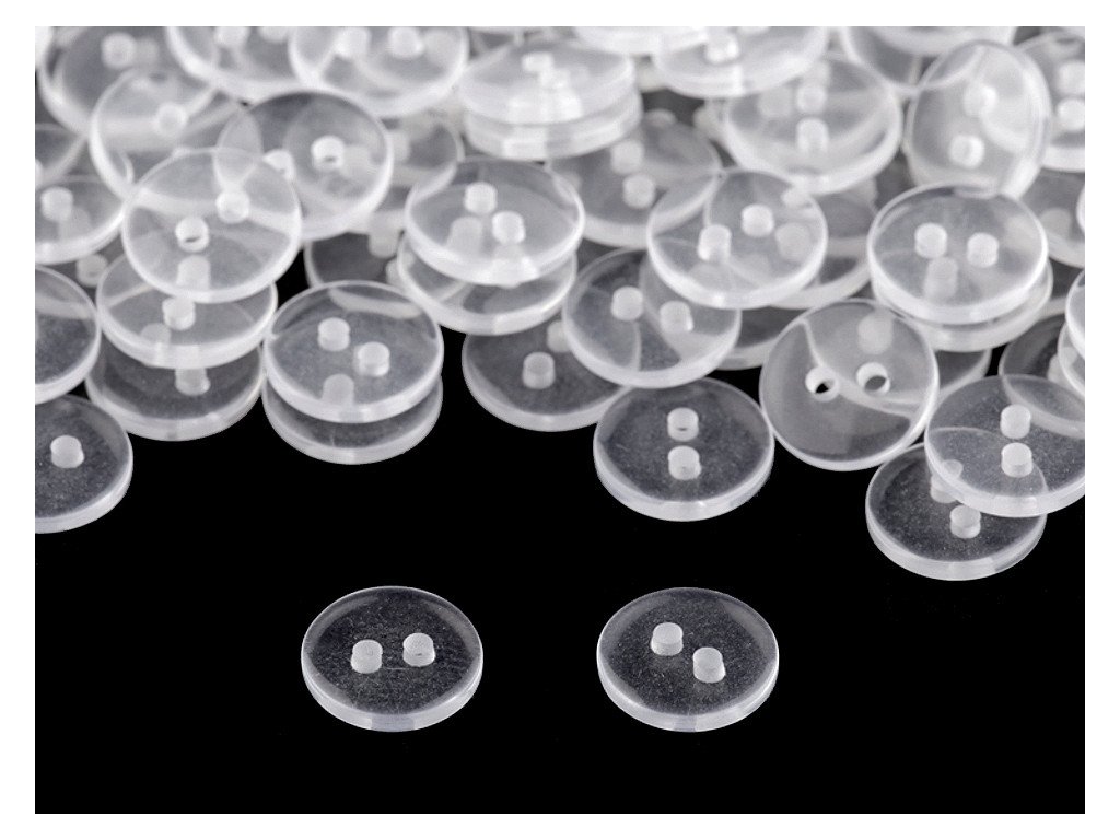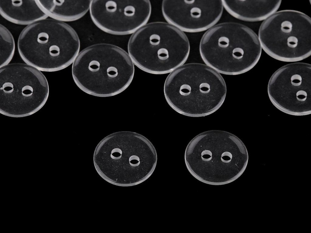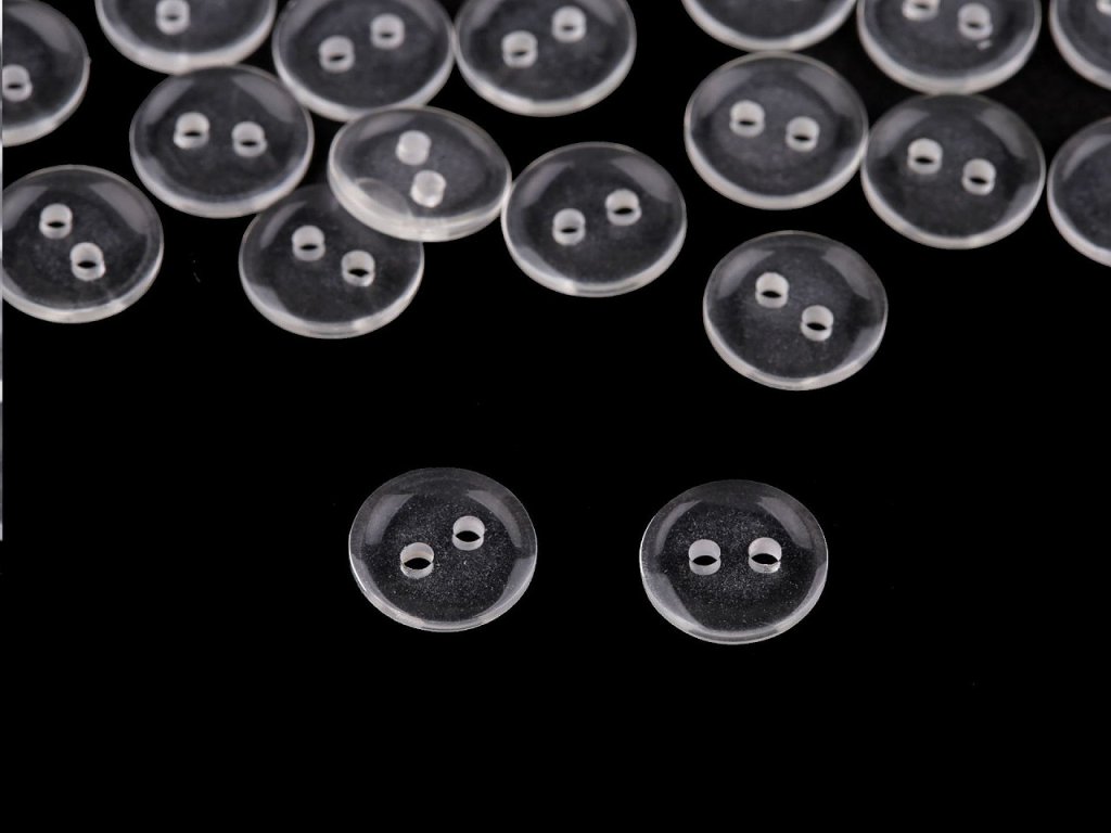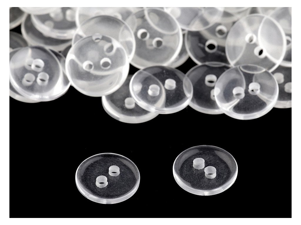 Transparentní dvoudírkové knoflíky jsou vhodné jako zapínání na košile, svetry, šaty i polštáře. Dají se použít také jako protikus. Mají kulatý tvar.