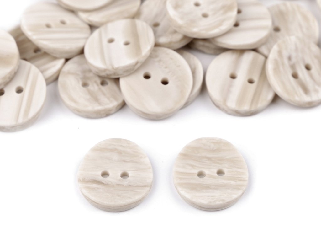 Dvoudírkové knoflíky mají zajímavý design - z rubové strany jsou rovné, z lícové strany jsou lehce vypouklé směrem dovnitř. Zabarvením imitují světlé dřevo. Vyniknou na svetrech, vestách, sakách, bundách apod. Velikost knoflíků naleznete v této tabulce.- Průměr: 15,5 mm