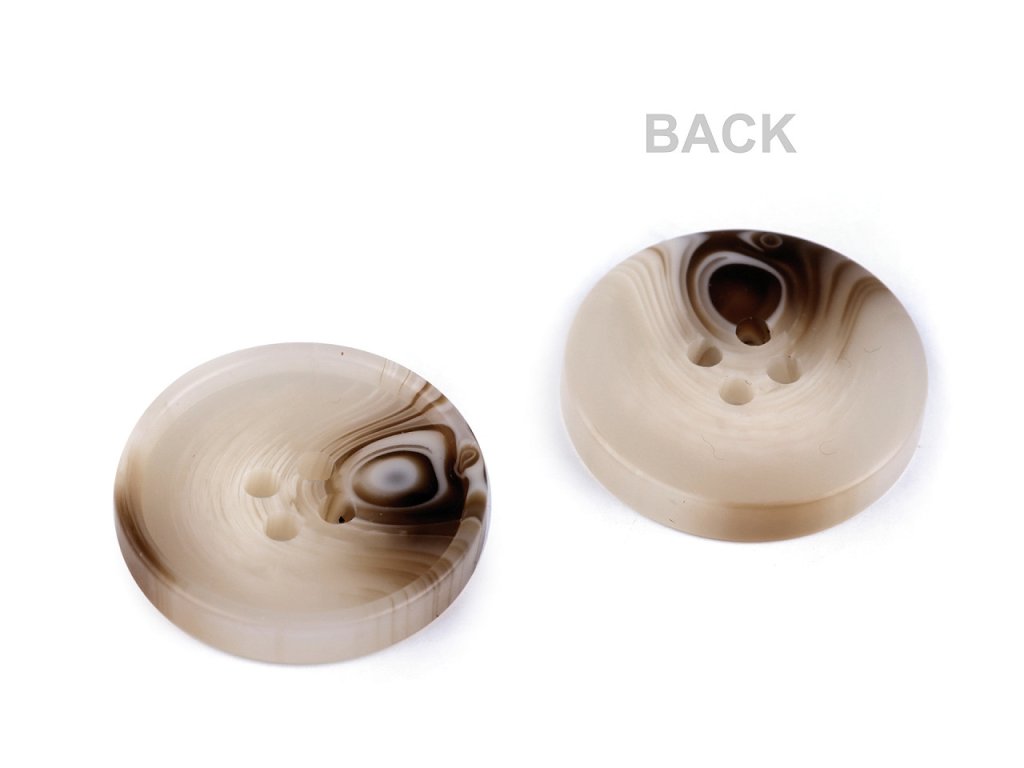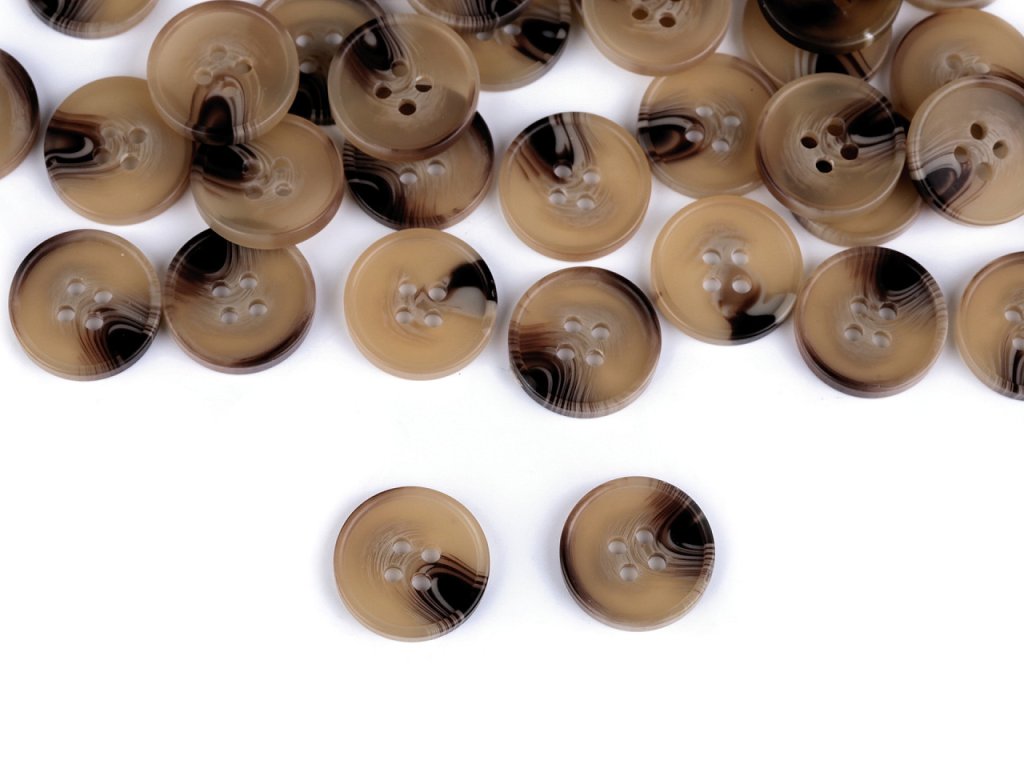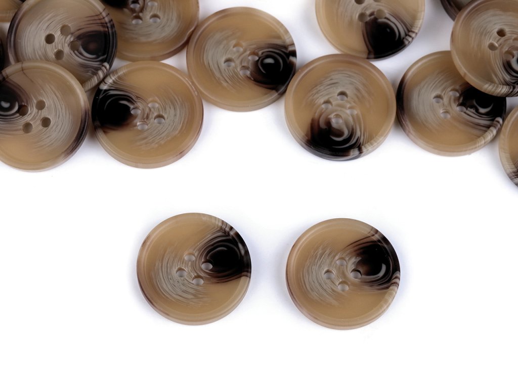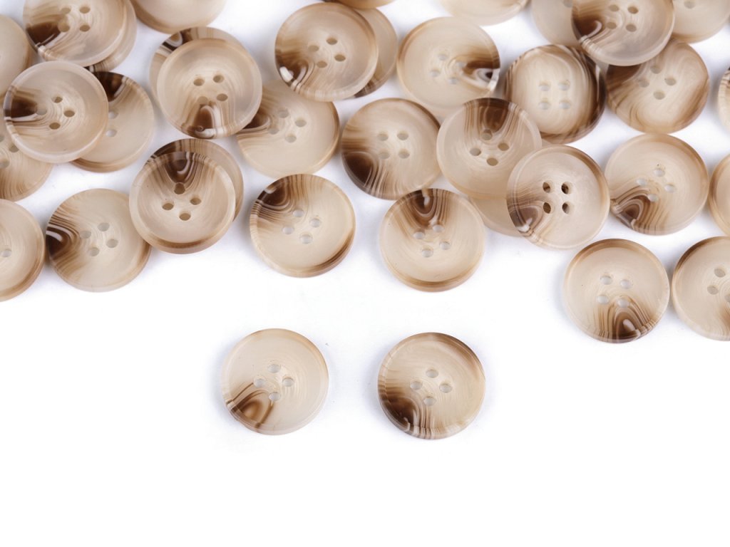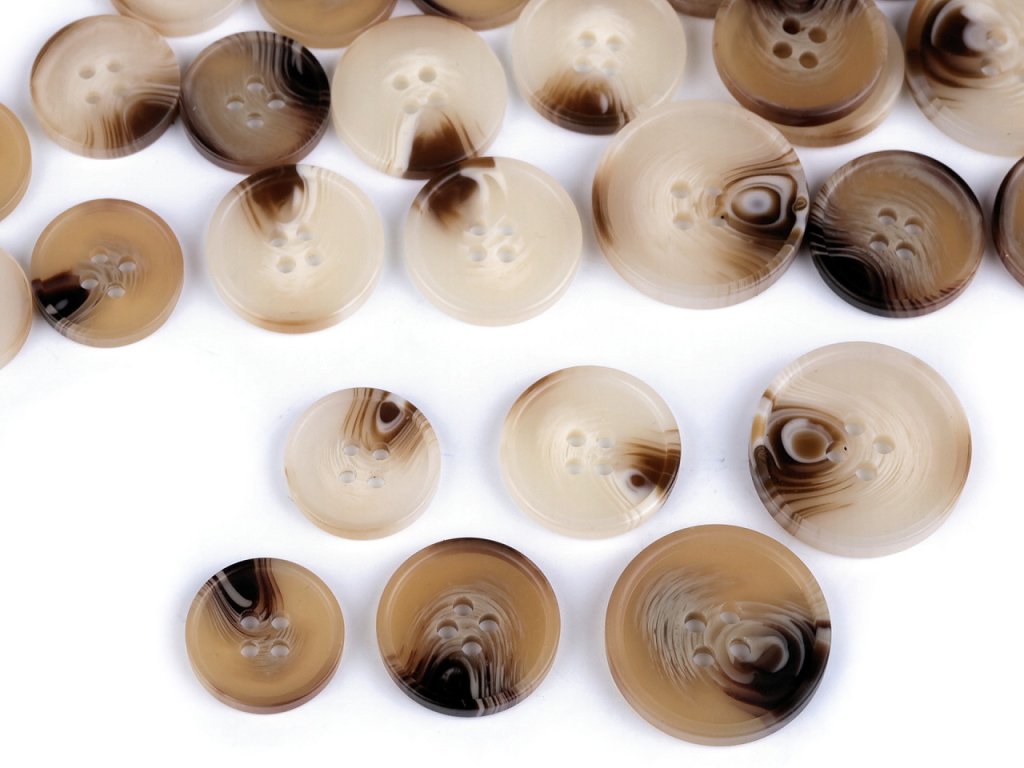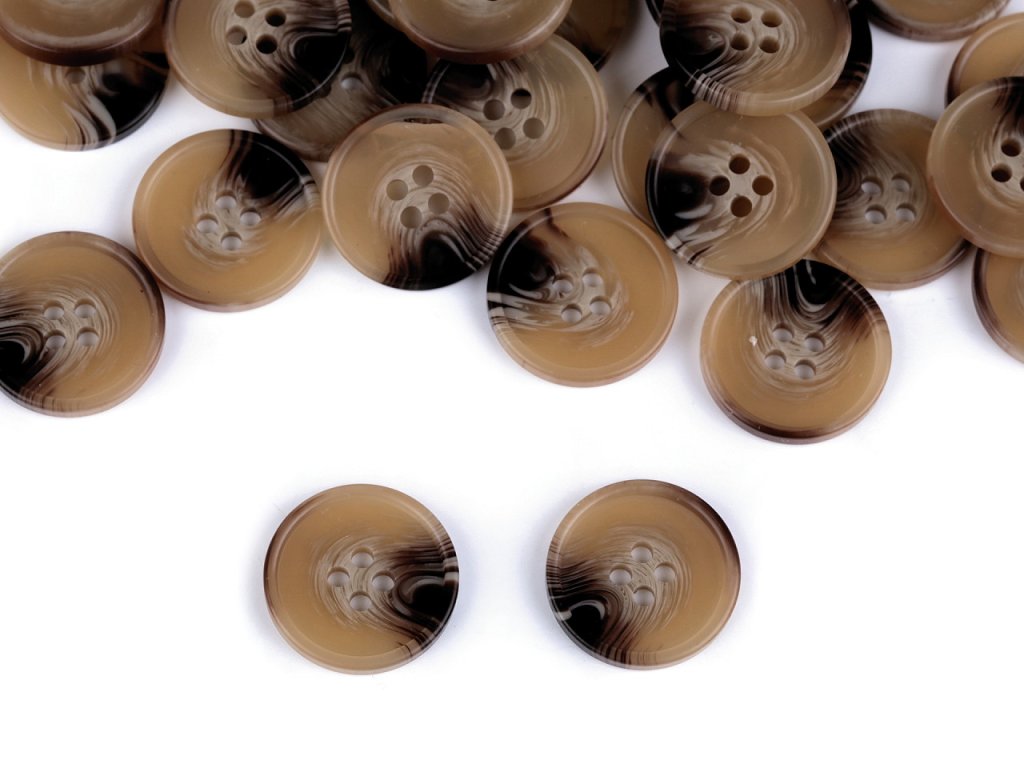 Čtyřdírkové designové knoflíky mají zesílený okraj. Vyniknou na kabátech, svetrech, vestách, sakách apod. Velikost knoflíků naleznete v této tabulce.- Průměr: 17,5; 20; 25 mm