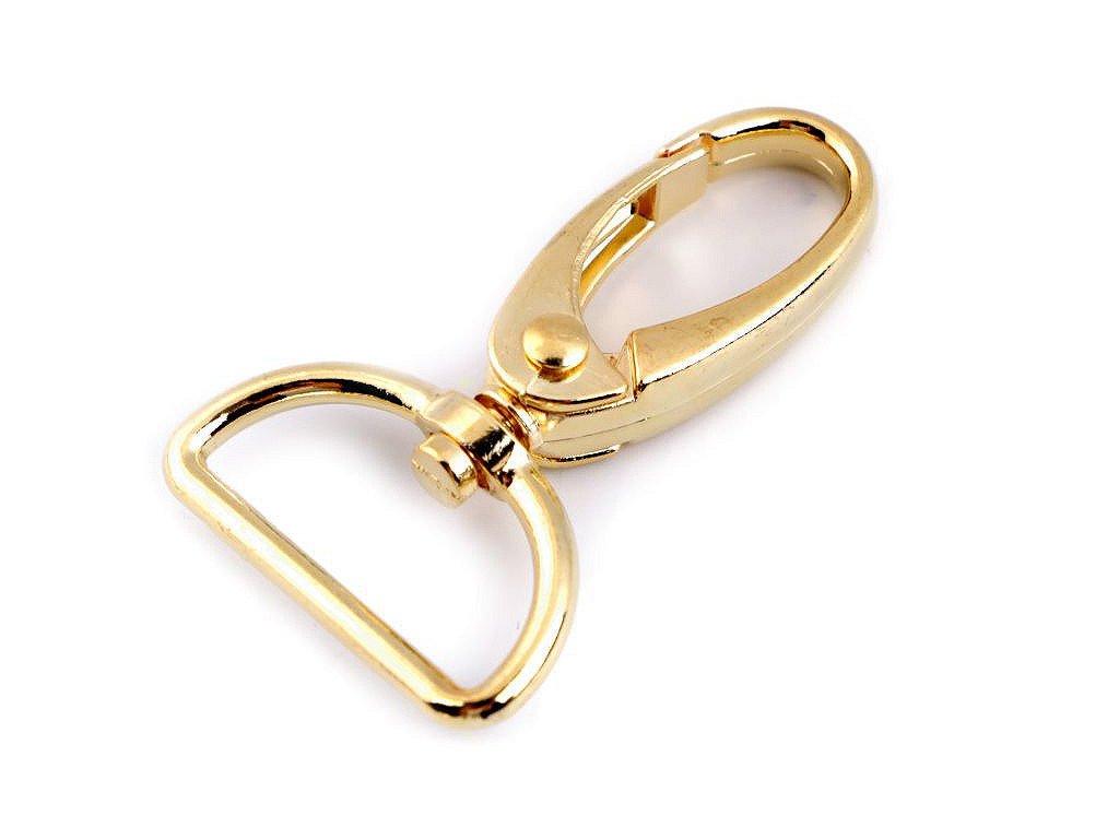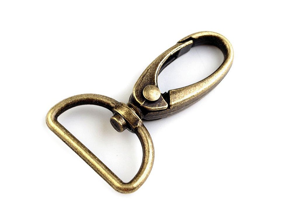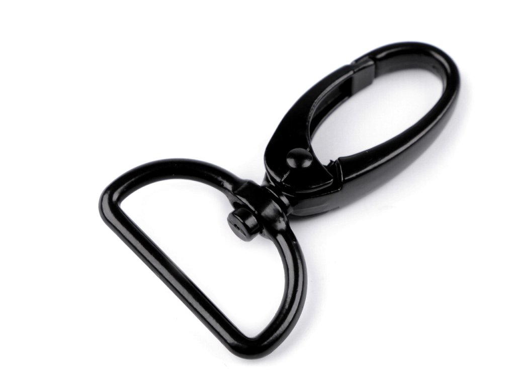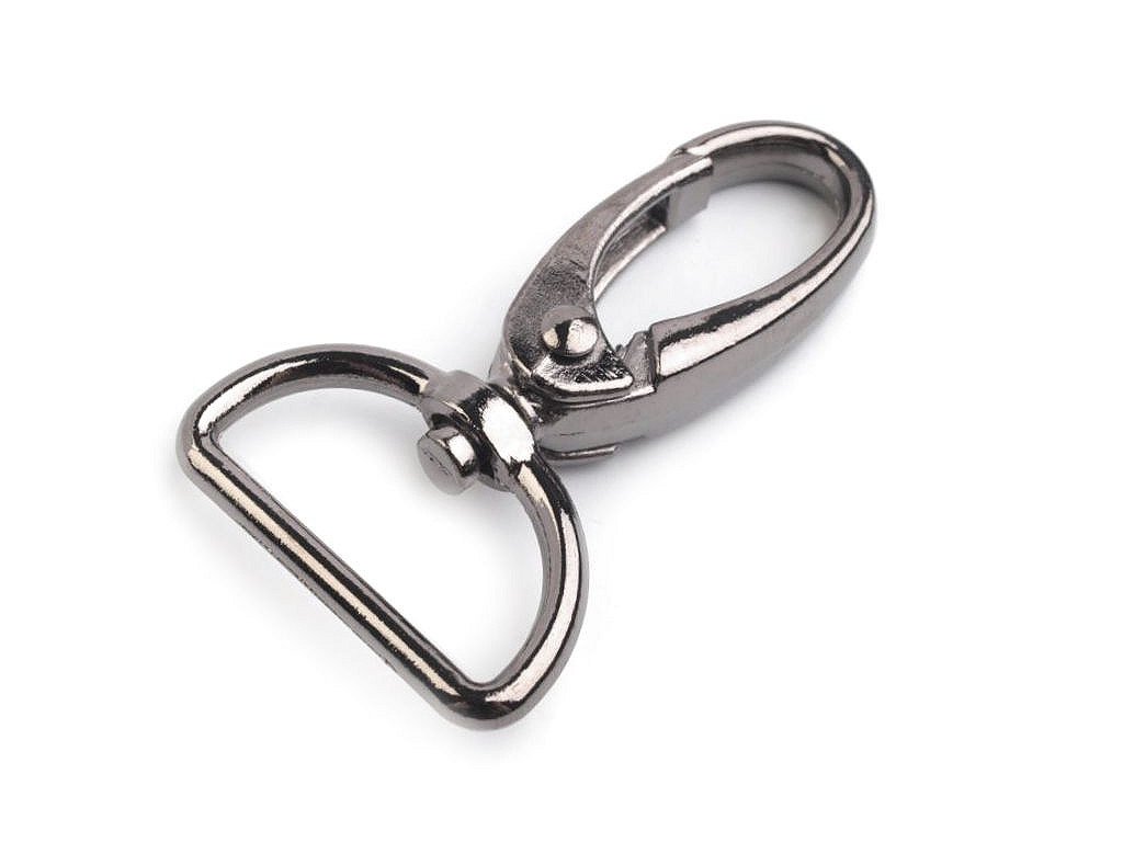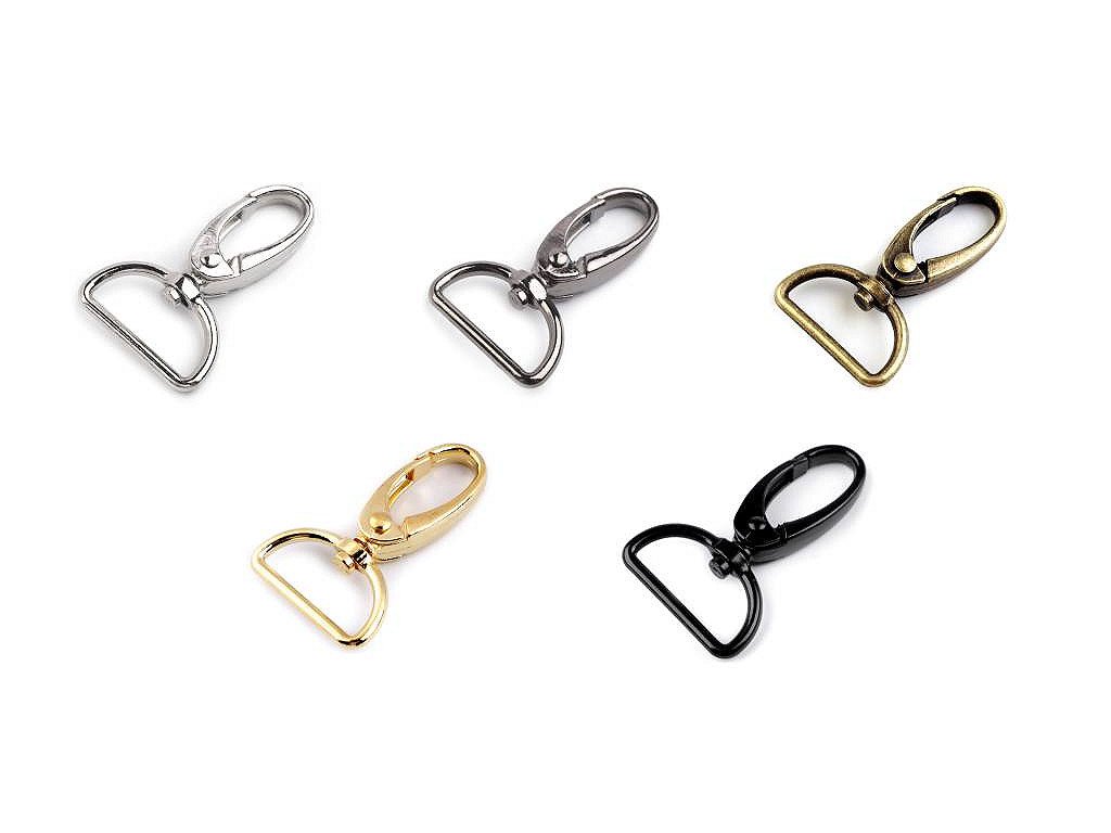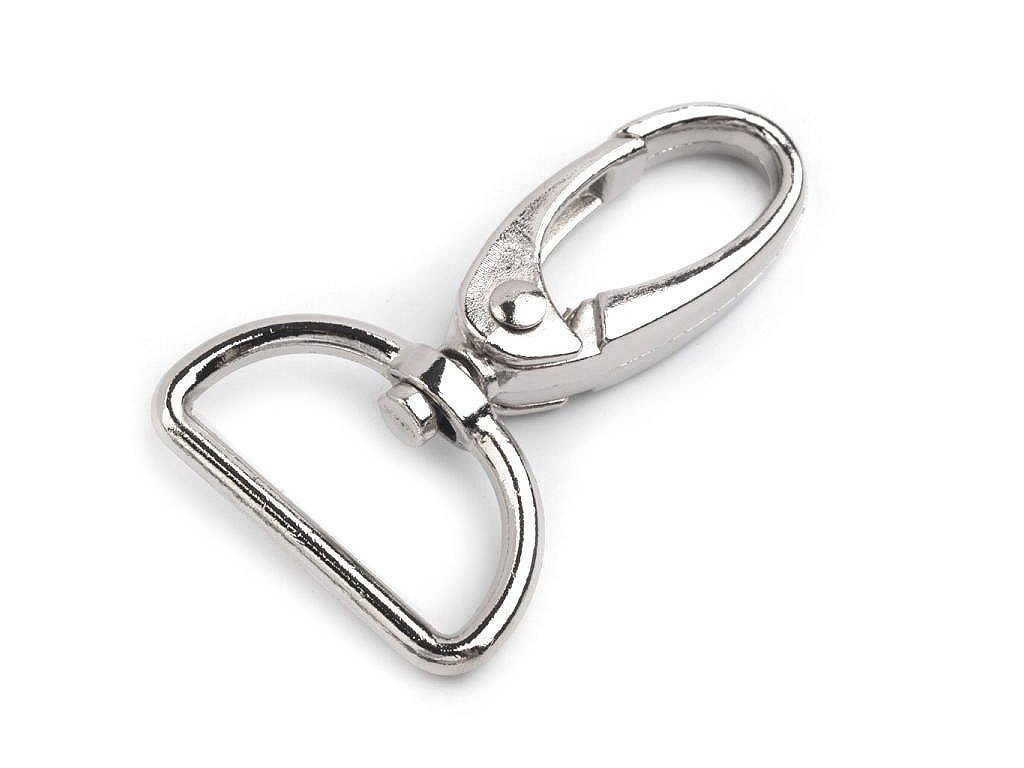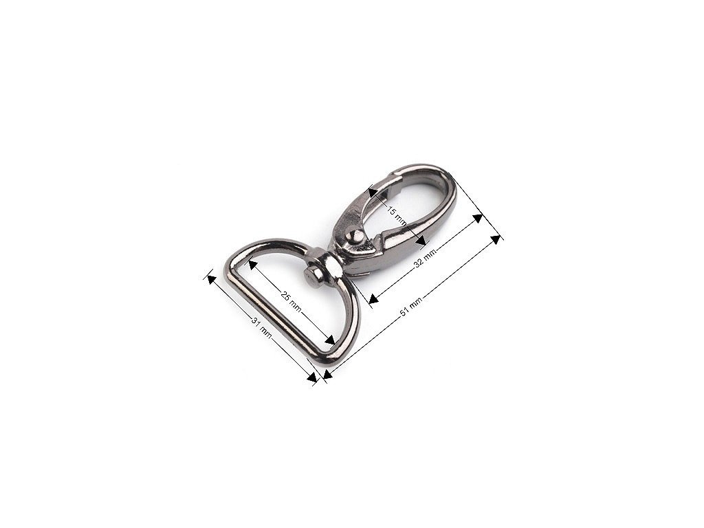 Kovovou otočnou karabinu využijete k připevnění popruhů ke kabelkám či taškám. Je vhodná také na výrobu klíčenek a vodítek pro vaše čtyřnohé miláčky. Netradičně ji můžete použít i jako ozdobné zapínání na ramínka šatů. Karabina je složena z nemagnetického kovu, magnetické je pouze kolečko uprostřed. Karabina je vhodná na popruh o šíři 25 mm.- Rozměry celkem: 31 x 51 mm