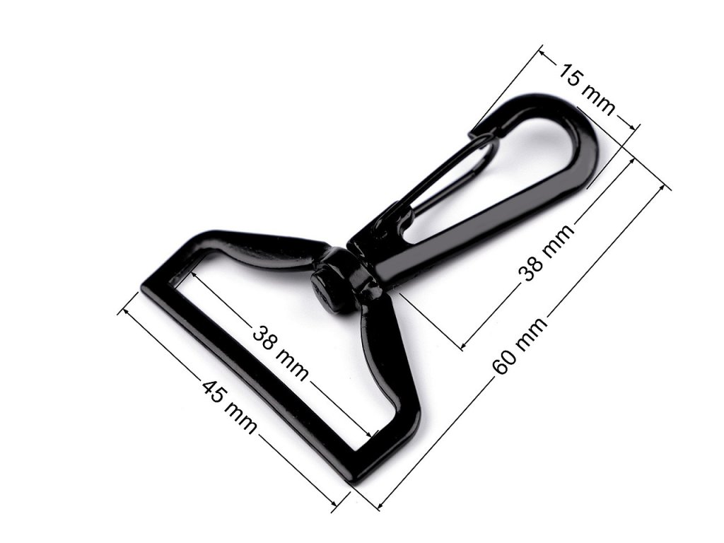 Kovovou karabinu využijete na upevnění popruhů k taškám, kabelkám apod. Je otočná.- Rozměry celkem: 45 x 60 mm