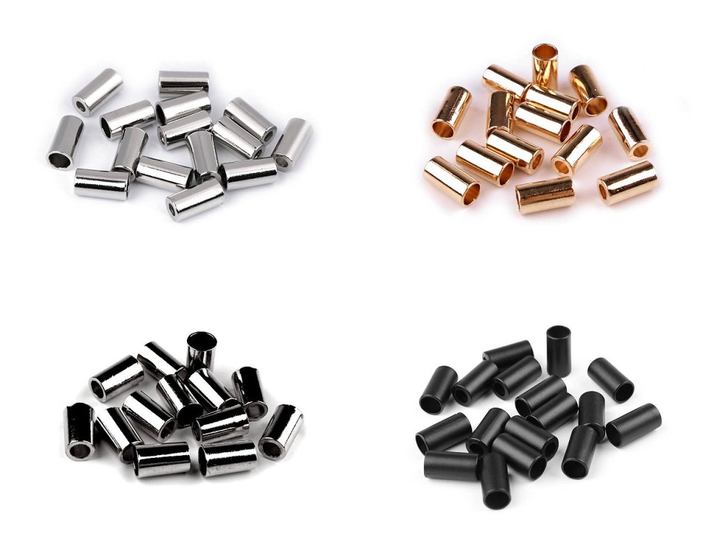 Hladká kovová koncovka zabraňuje vytažení šnůry z tunýlku. Využijete ji k zakončení šňůrek, které lemují rukávy, kapuce nebo spodní lem mikin a bund. Varianty č. 1, 2, 3, 7 mají rozměry 8 x 15 mm. Menší průvlek na jednom konci má průměr 3,5 mm a větší na druhém konci 5,7 mm. Varianty č. 4, 5, 6, 8 mají rozměry 9 x 15 mm. Menší průvlek na jednom konci má průměr 5,5 mm a větší na druhém konci 7,7 mm.- Rozměry: 8; 9 x 15 mm