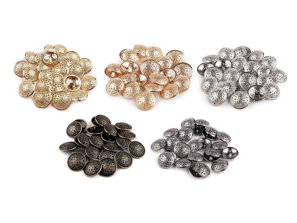 Kovové knoflíky s filigránovým vzorem jsou vyrobené ze slitiny zinku a nemagnetických kovů. Mají spodní přišívání. Knoflíky elegantně vyniknou na kabátech, sakách, košilích apod. Zajímavě ozdobí také kabelky, tašky nebo klobouky. Knoflíky jsou baleny v sáčku.Velikost knoflíků naleznete v této tabulce. Zinek chrání kov proti korozi. Pozinkované výrobky po vyprání zůstávají beze změn.- Průměr: 21,6; 22,7 mm
