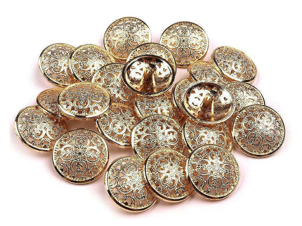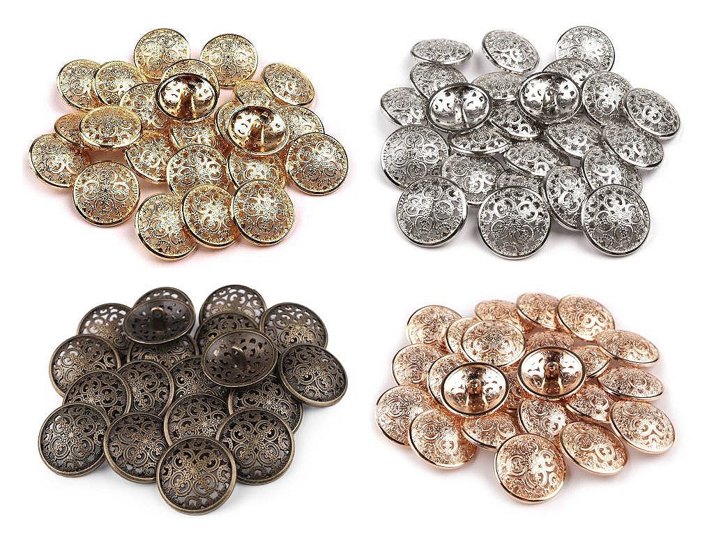 Filigránový vzor dodává knoflíkům umělecký nádech. Jsou vyrobené ze slitiny zinku a nemagnetických kovů. Mají spodní přišívání. Knoflíky podtrhnou dokonalost kabátů, sak apod. Vyniknou také na doplňcích jako jsou kabelky, tašky nebo klobouky. Knoflíky jsou baleny v sáčku.Velikost knoflíků naleznete v této tabulce. Zinek chrání kov proti korozi. Pozinkované výrobky po vyprání zůstávají beze změn.- Průměr: 25 mm