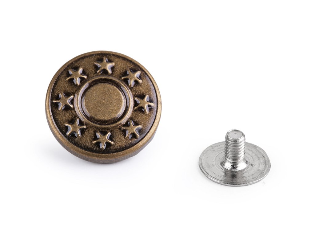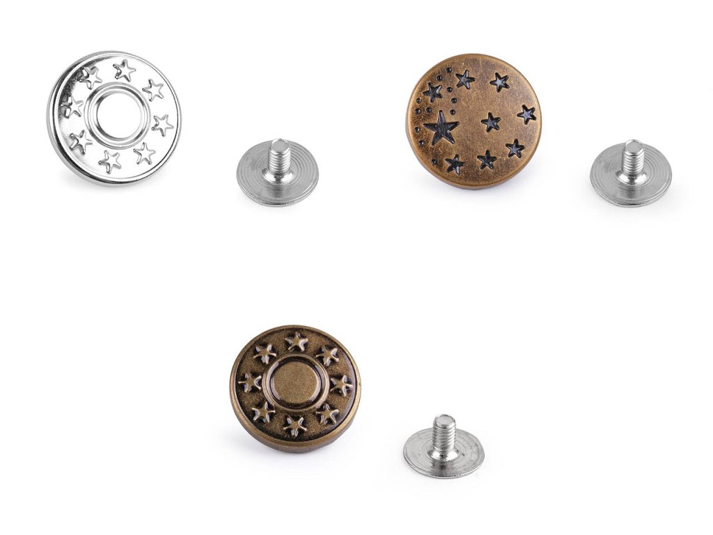 Kovový riflový knoflík je výjimečný tím, že se nenaráží, ale šroubuje, a tak vám ušetří práci i čas. K aplikaci nepotřebujete žádné další pomůcky. Skládá se ze dvou částí - samotného knoflíku a šroubovacího nýtu. Knoflíky vyniknou na riflích, džínových bundách, vestách, šatech apod. Délka nýtu je 4 mm. Velikost knoflíků naleznete v této tabulce.- Průměr: 17 mm