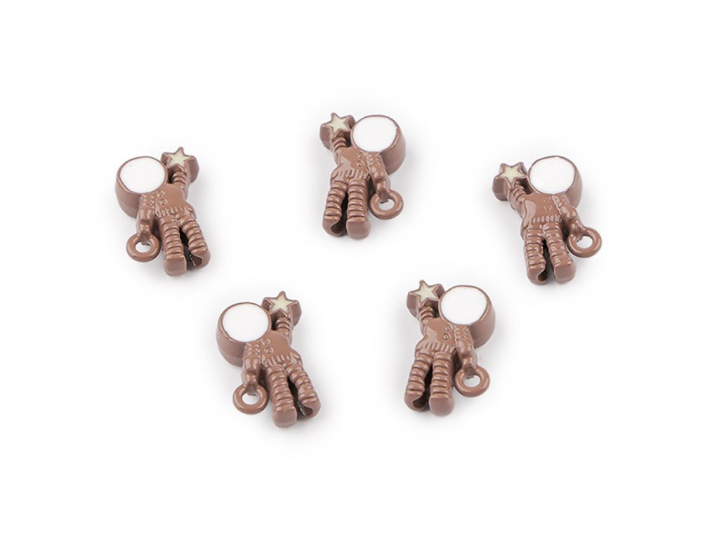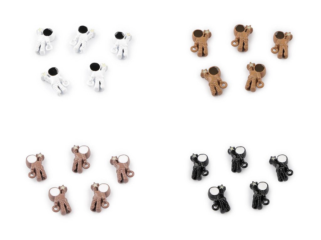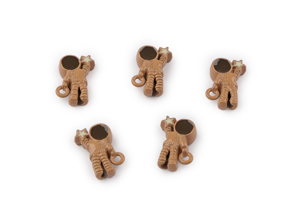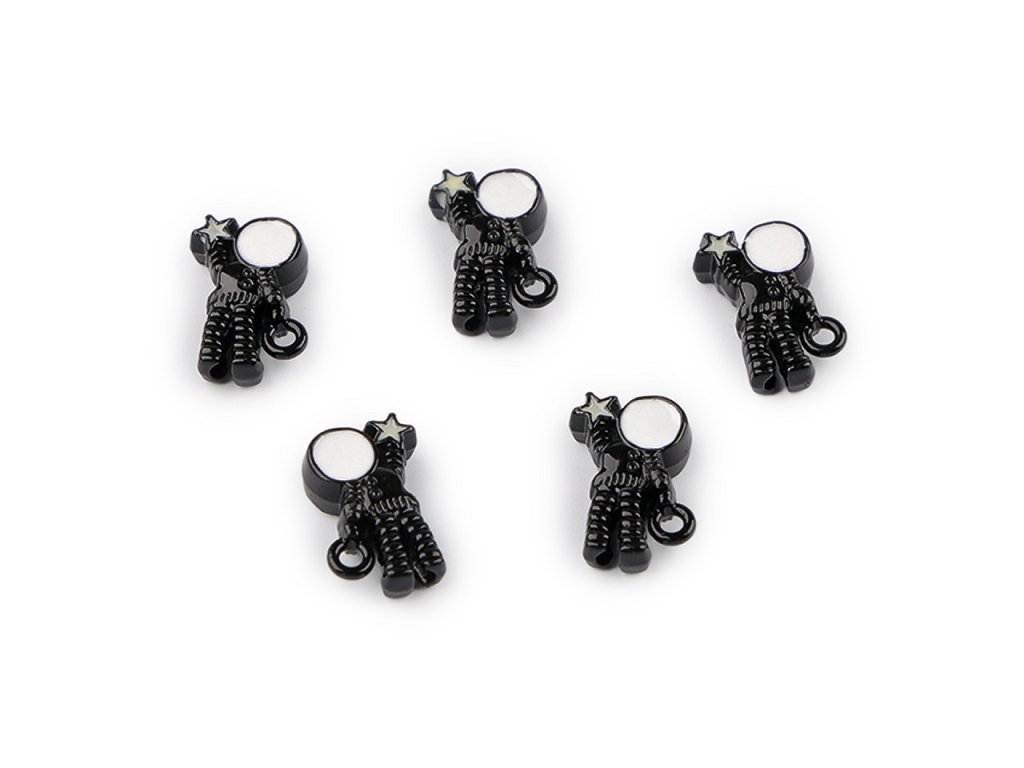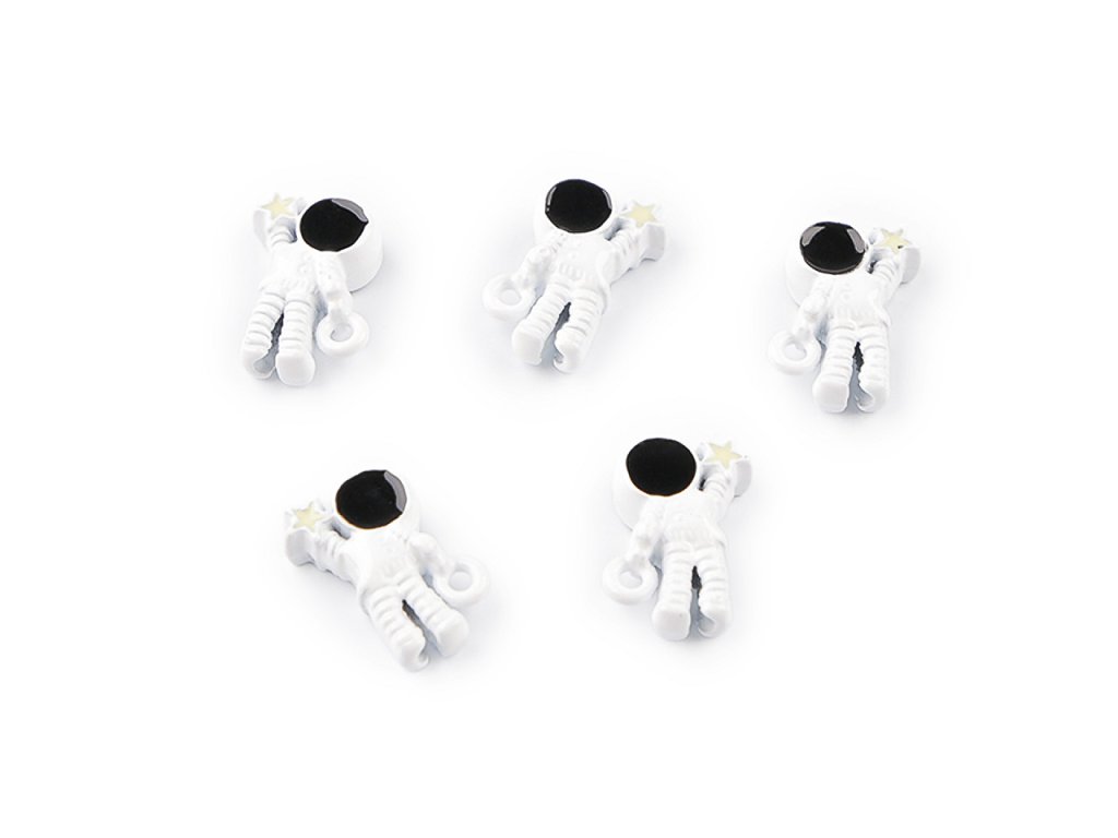 Kovový přívěsek kosmonauta je perfektně zpracovaný, díky povrchovému laku se jemně leskne. Jeden průvlek má u ruky, ale celým jeho středem těla - od hlavy k patě - vede další průvlek, díky kterému se dá kosmonaut navléknout jako klasický korálek. Při navlékání se budou kosmonauti řadit nad sebe. Perfektně dozdobí šperky, ale i dárek, přání apod. Budou z nich krásné náušnice, oživí náramek i náhrdelník. Přívěsek je oboustranný.- Šířka: 8 mm