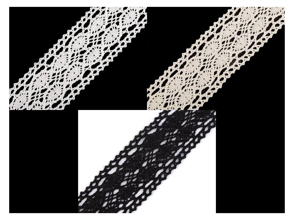 Bavlněná paličkovaná krajka se zajímavým vzorem má okraje zakončené očky. Doporučujeme ji žehlit přes tkaninu. Použití: Krajku můžete využít k olemování polštářů, ubrusů, deček a oděvů. Můžete ji také použít jako dekoraci na různá přání či alba. Krajka může mít v návinu až 2 prostřihy. Šíře krajky se po konečné úpravě může lišit o ±6%.- Šíře: 40 mm