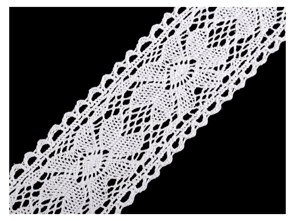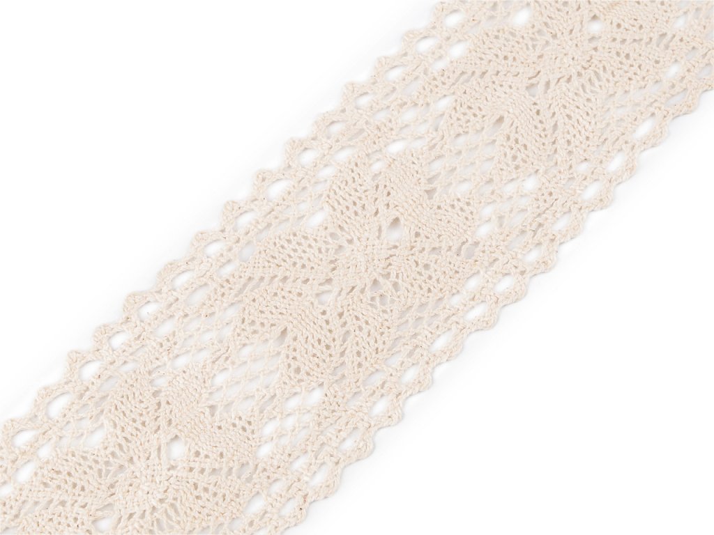 Široká paličkovaná krajka se vzorem květů dodá vašim výrobkům a dekoracím nádech vintage stylu. Je pevná, vyrobená z kvalitní bavlny. Použití: S krajkou můžete olemovat polštáře, závěsy, ubrusy, dečky i oděvy. Je vhodná také na originální zdobení papírových nebo dřevěných krabic. Šíře krajky se po konečné úpravě může lišit o ±6%.- Šíře: 55 mm