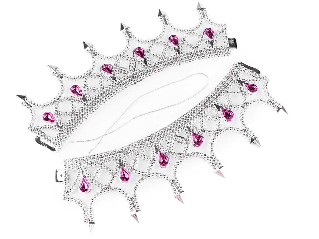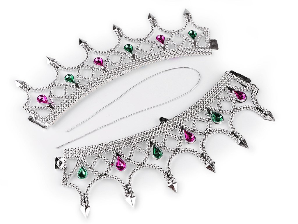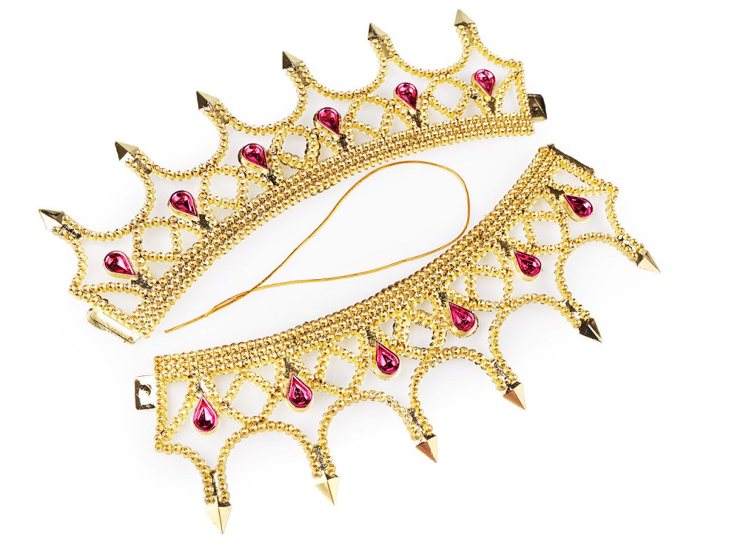 Jde vaše dítko na maškarní ples? Častou maskou jsou princezny a královny. Naše korunka bude to pravé. Koruna se skládá ze dvou částí, které lze snadno spojit zaklapnutím. Obsahuje pružnou gumičku, kterou navléknete na krk, a díky té bude korunka lépe držet na hlavě. Korunka je plastová, ozdobená nabarvením a kulatým vzorkem, který vytváří světelné odlesky. Působí velmi bohatě, ale je lehká. Zlatá barva může být v různých odstínech. Různé odstíny může mít i barva kamínků.- Průměr: cca 14 cm
