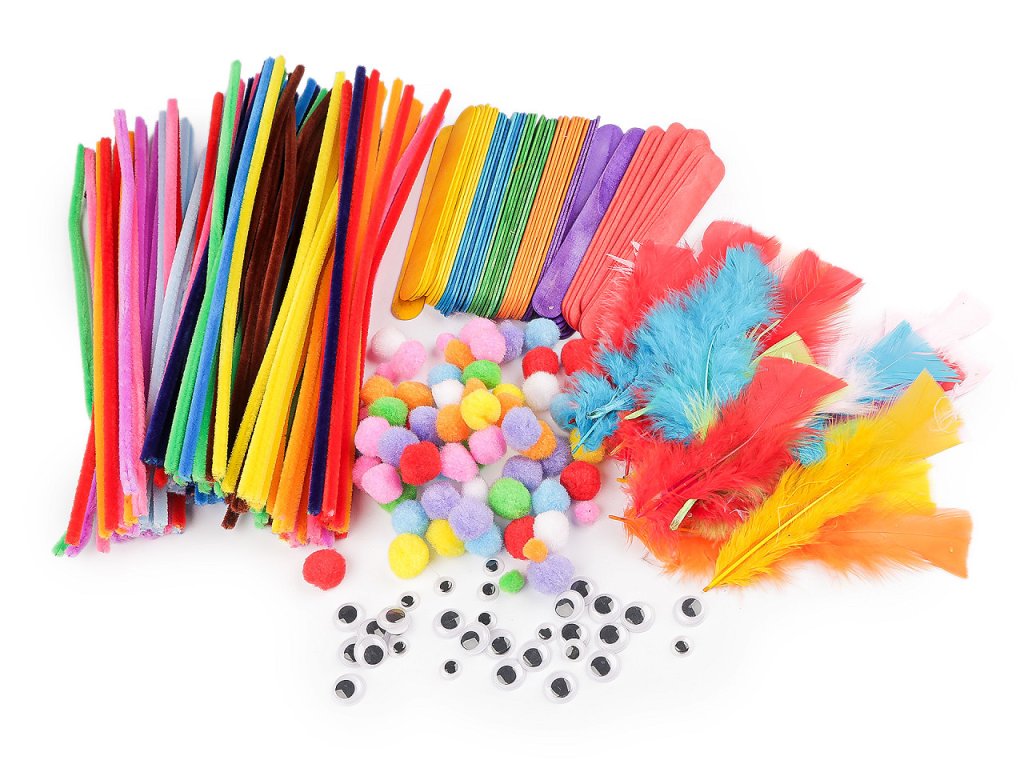S velkou kreativní sadou si děti mohou rozvíjet svou vlastní fantazii. Mohou si vyrobit různé postavičky, dekorace, domečky, obrázky, zkrátka je v ní vše potřebné, co se může malým kutilům hodit. Věříme, že vás i vaše děti tato kreativní sada nadchne. Sada obsahuje: - chlupaté drátky - 100 ks - samolepicí oči - 100 + 50 ks - plyšové bambulky - 100 + 100 ks - pírka - 50 ks - dřevěné špachtle - 50 ks. Složení sady se může lehce barevně lišit.- Průměr bambulky: cca 10; 18 mm