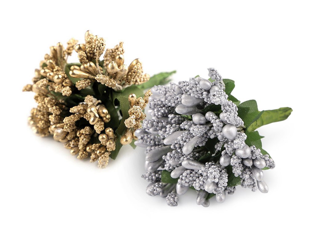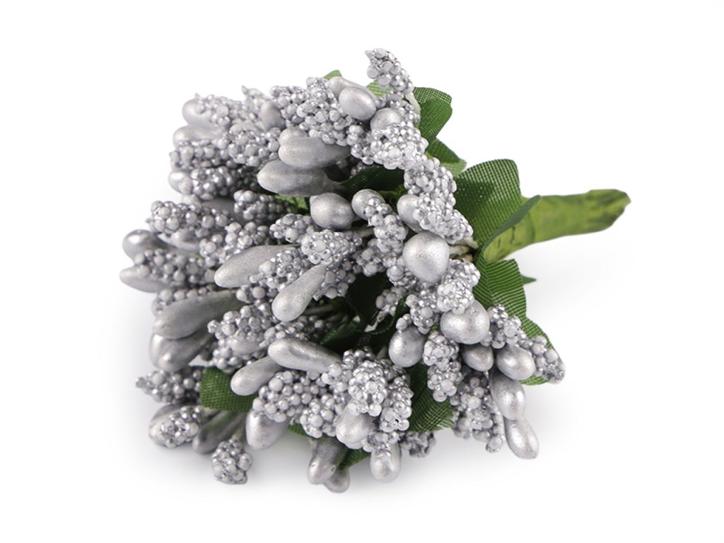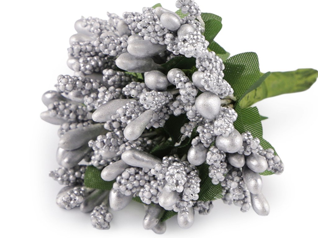 Metalické pestíky jsou pevné, drží na kovovém drátku, který je obalený floristickou páskou. Na jednom drátku je malý trs složený z pestíků, bobulek a kališního lístku. Pestíky můžete zakomponovat do středu umělých květů nebo do věnců a vazeb. Jsou vhodné i na zapichování do polystyrenových polotovarů. Skvěle doplní květinové věnečky do vlasů, fascinátory a čelenky. Jeden svazek obsahuje 10 trsů.- Délka: cca 8 cm