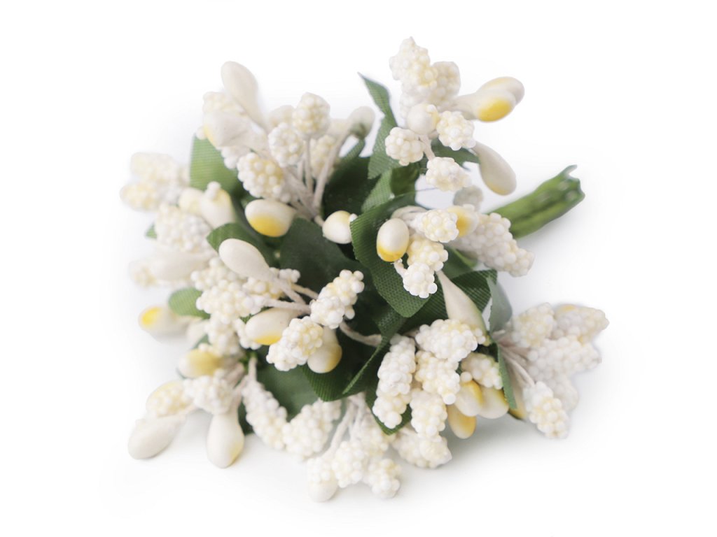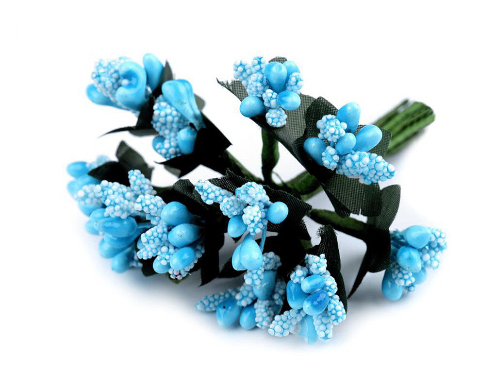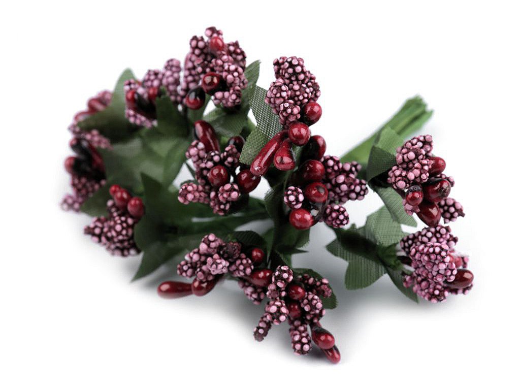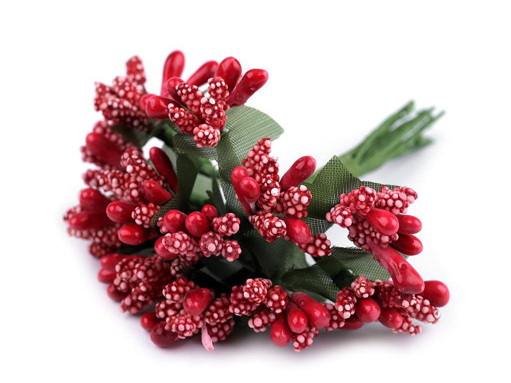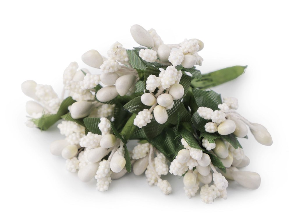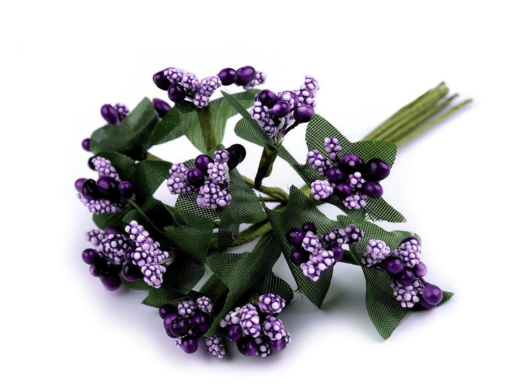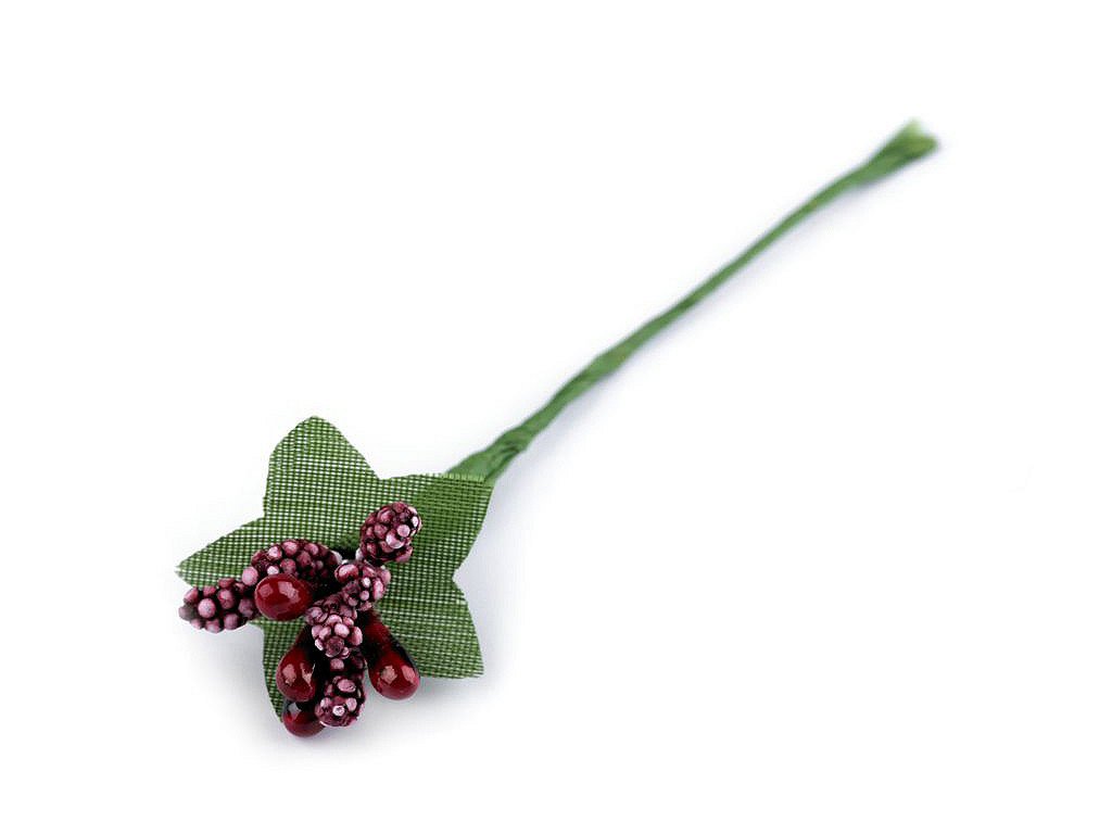 Bobulky drží na kovovém drátku, který je obalený floristickou páskou. Na jednom drátku je malý trs složený z pestíků, bobulek a kališního lístku. Použití: Bobulky vyniknou v umělých květech, věncích i dekoračních vazbách. Můžete je také použít jako pestíky při výrobě květin z foamiranu. Jedinečně doplní květinové věnečky do vlasů, fascinátory a čelenky. Jeden svazek obsahuje 12 kusů.- Délka: cca 9 cm
