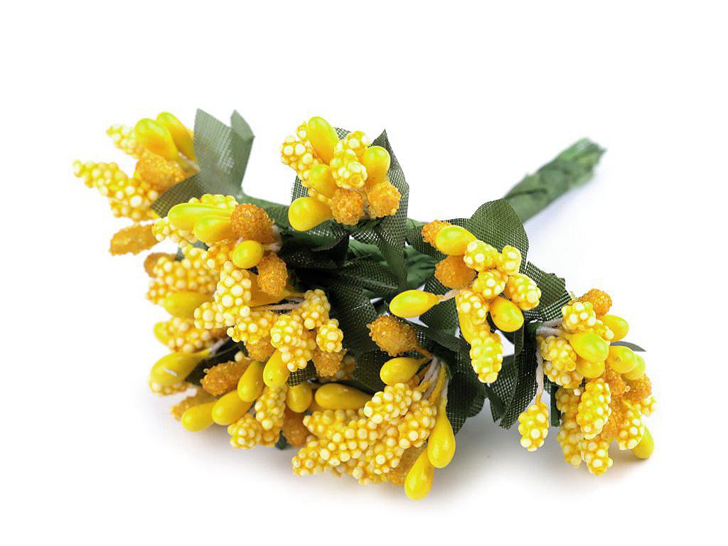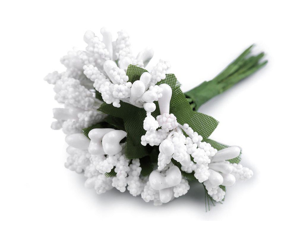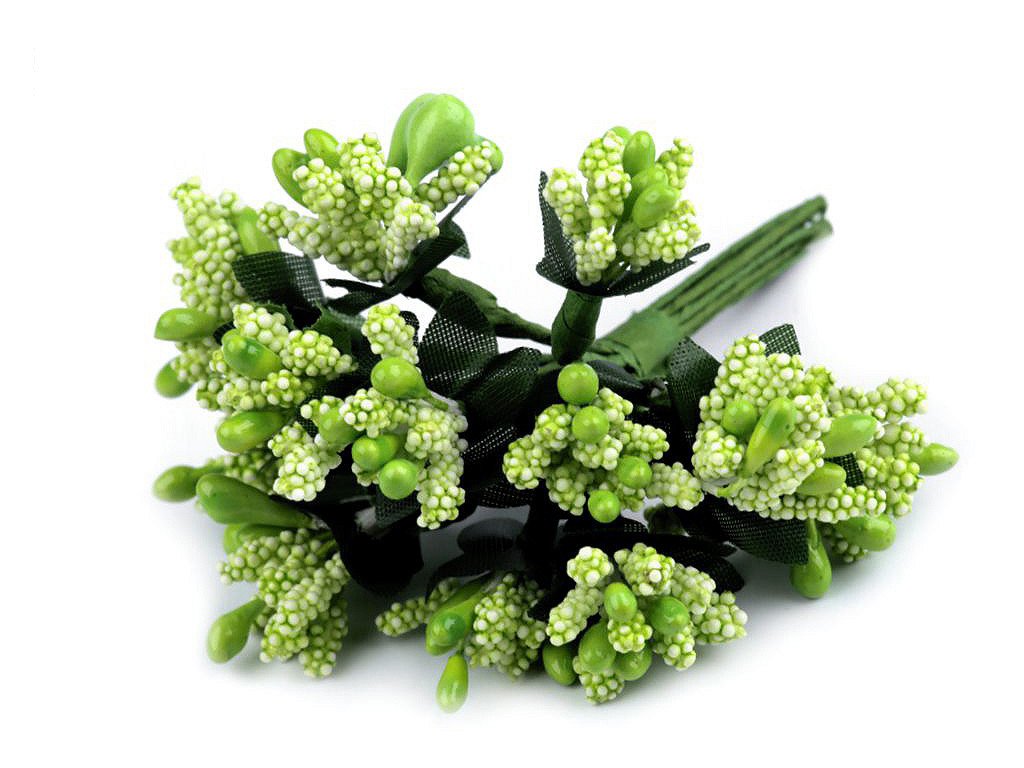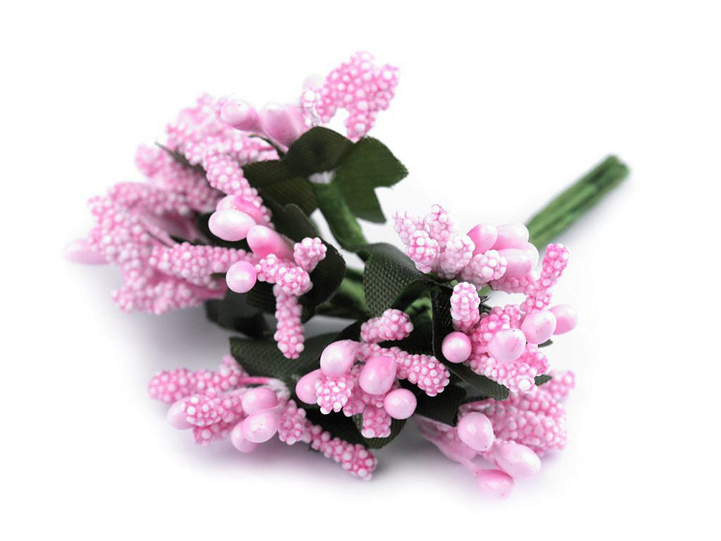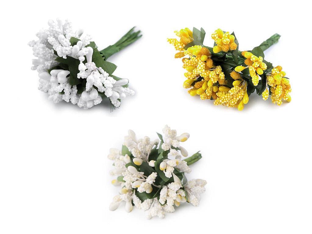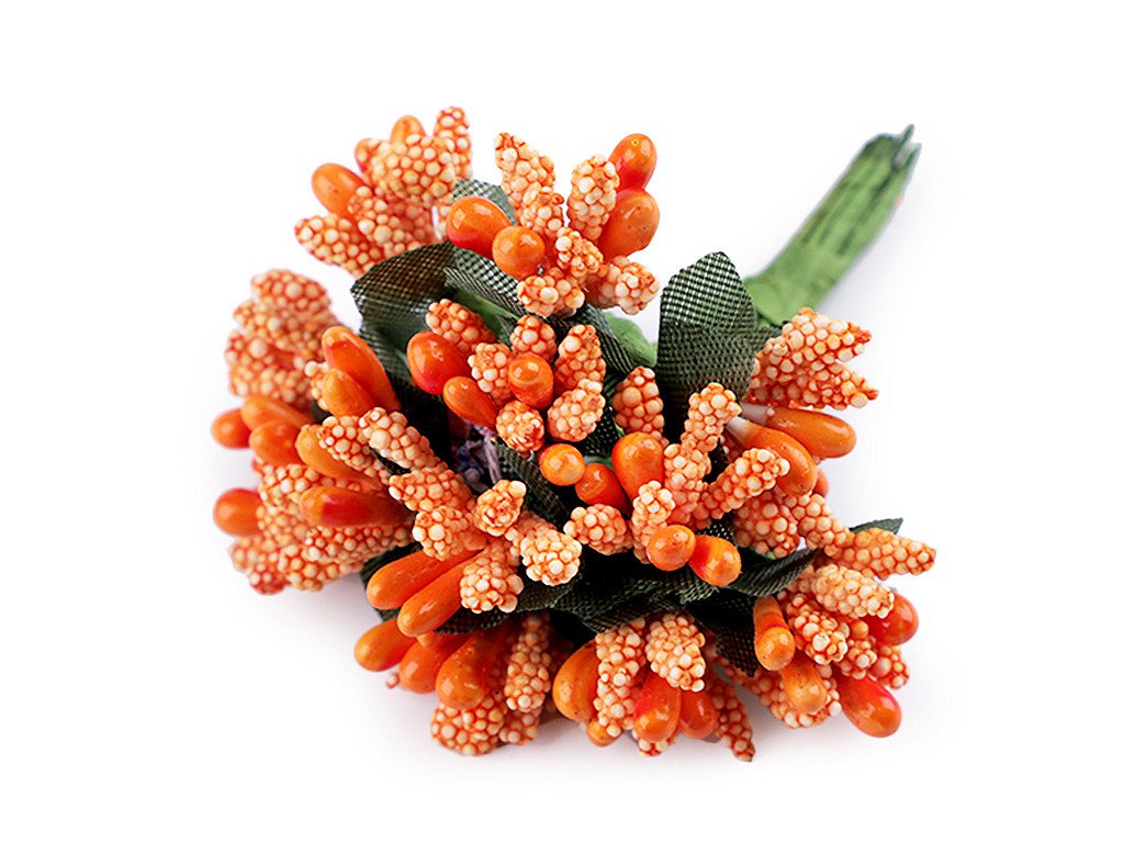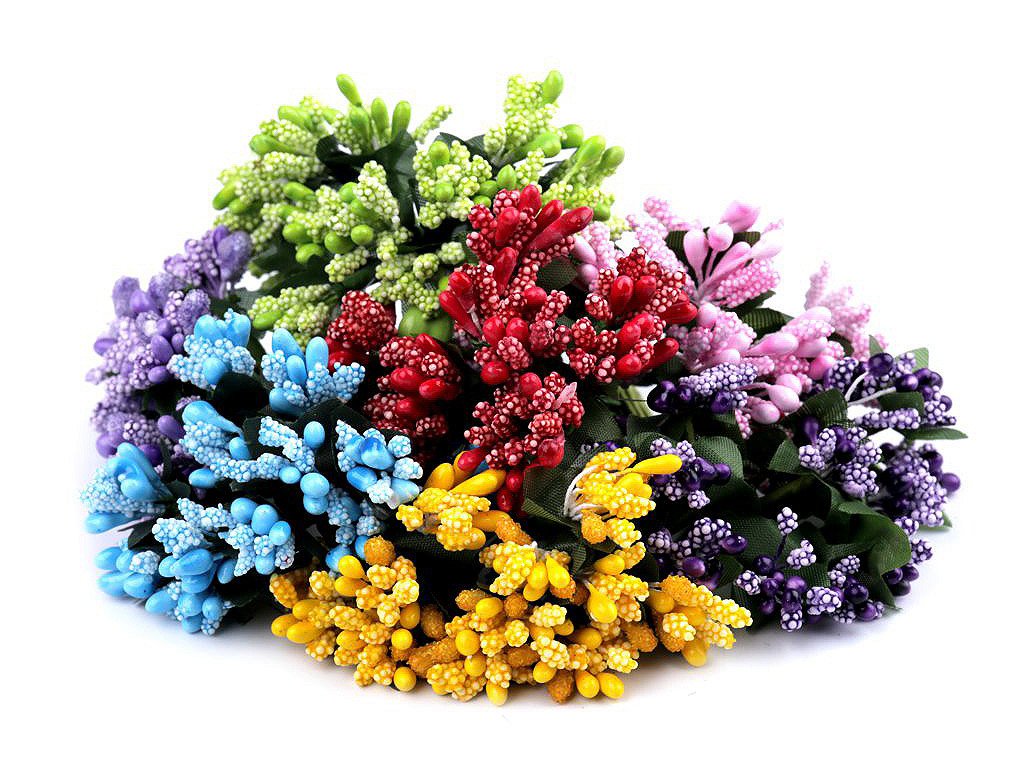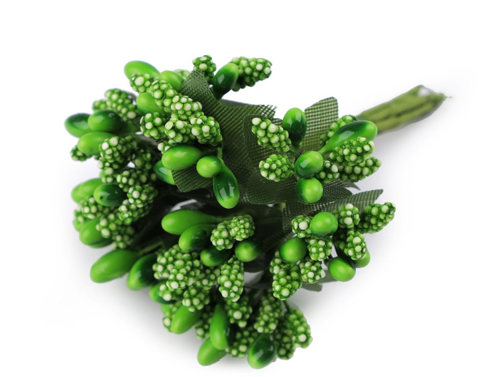 Bobulky drží na kovovém drátku, který je obalený floristickou páskou. Na jednom drátku je malý trs složený z pestíků, bobulek a kališního lístku. Použití: Bobulky vyniknou v umělých květech, věncích i dekoračních vazbách. Můžete je také použít jako pestíky při výrobě květin z foamiranu. Jedinečně doplní květinové věnečky do vlasů, fascinátory a čelenky. Jeden svazek obsahuje 12 kusů.- Délka: cca 9 cm