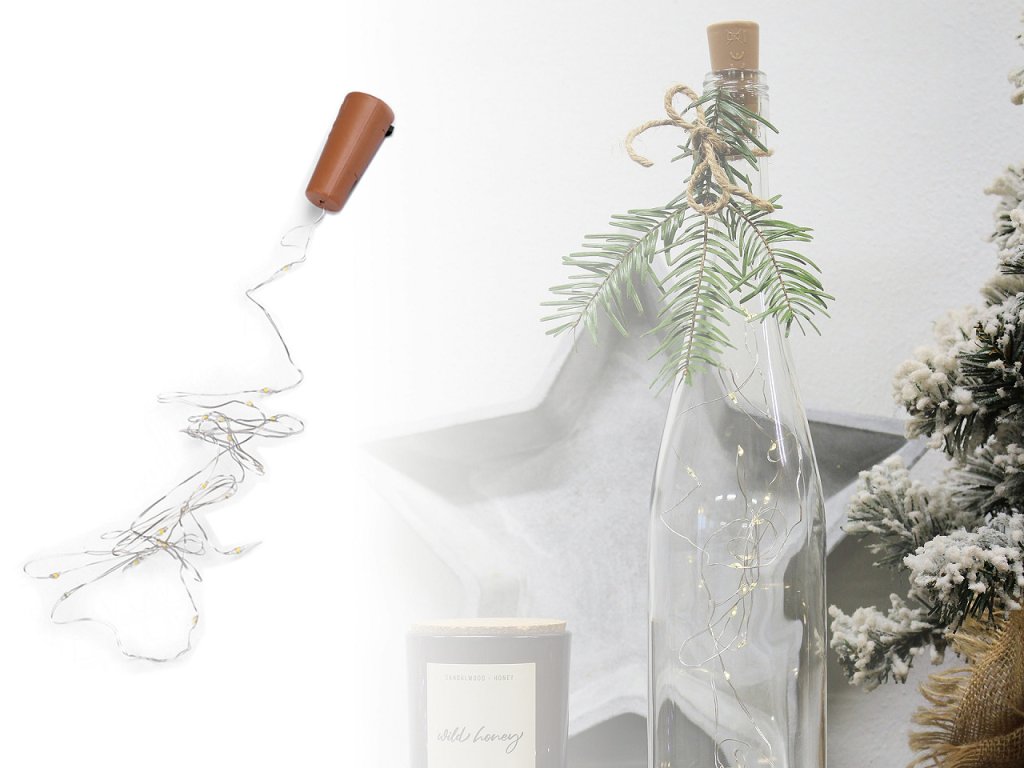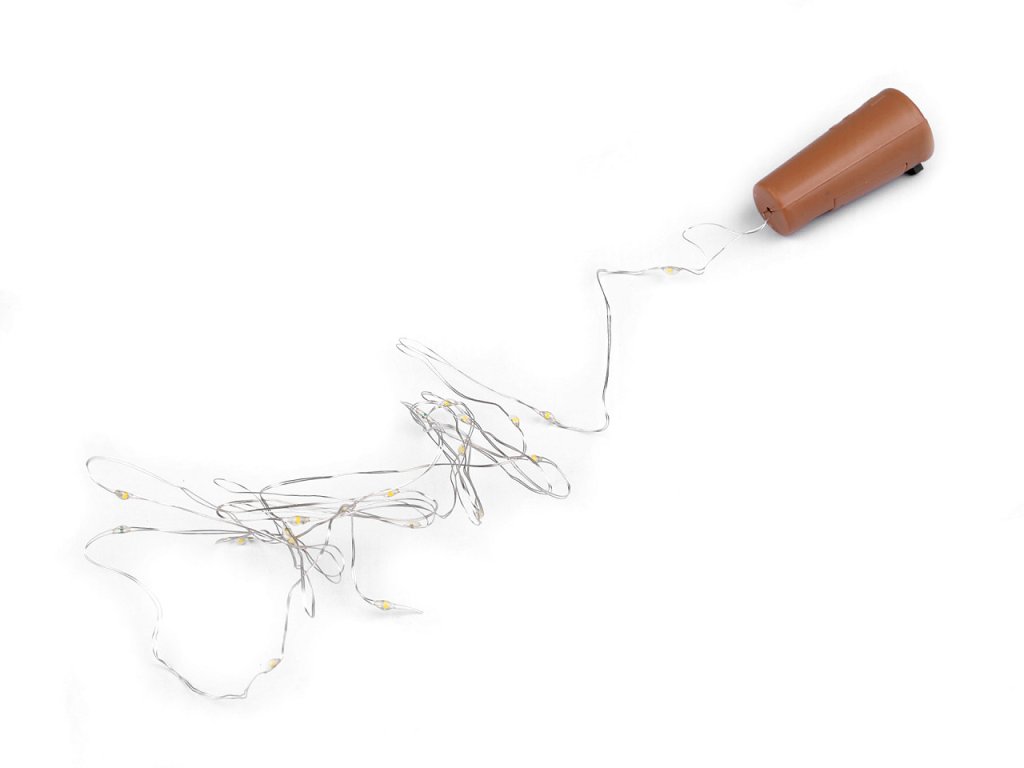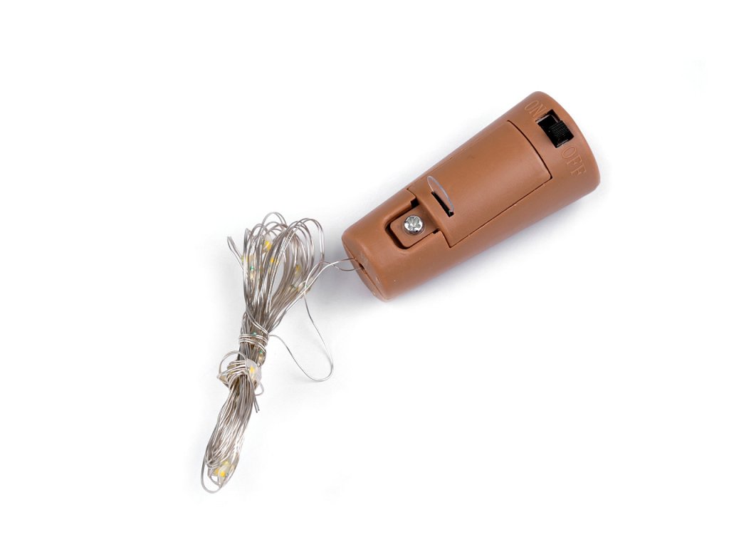 LED osvětlení v podobě špuntu využijete na jakékoliv prázdné skleněné láhve (od vína, piva, lihovin apod.) Najdete na něm 20 LED diod. Díky drátu ho můžete i dobře tvarovat. Dekorace svítí studeným světlem, nebliká. Špunt je vhodný k celoročnímu použití. Baterie (3x LR44) jsou součástí balení. Horní průměr špuntu je 2,2 cm, dolní průměr je 1,5 cm. Délka špuntu je 4,7 cm.- Délka: 2 m
