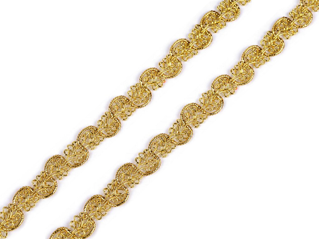 Propletený leonský prýmek působí díky třpytivému lurexu velmi slavnostně. Je pevný. Použití: Prýmek využijete jako ozdobu na šaty, sukně, halenky nebo taneční, divadelní a karnevalové kostýmy. Je vhodný také k ozdobení doplňků, například klobouků, čepic, rukavic a kabelek. Využijete ho i u nešitého patchworku, kde s ním můžete ozdobit polystyrenové polotovary.- Šíře: 12 mm