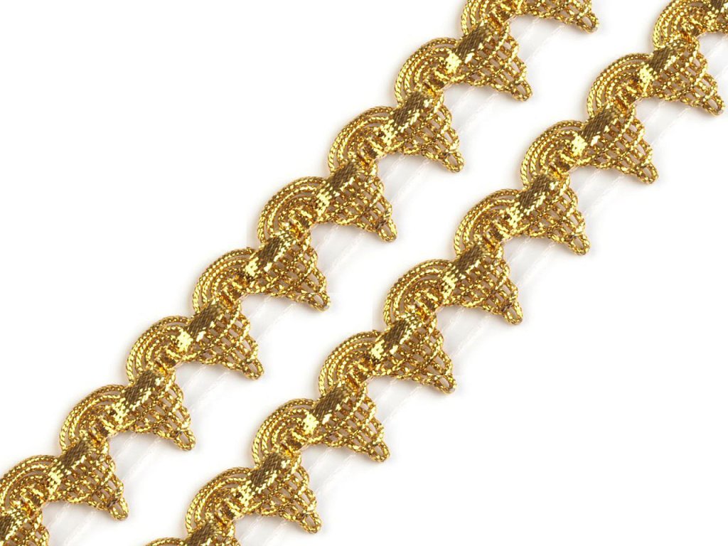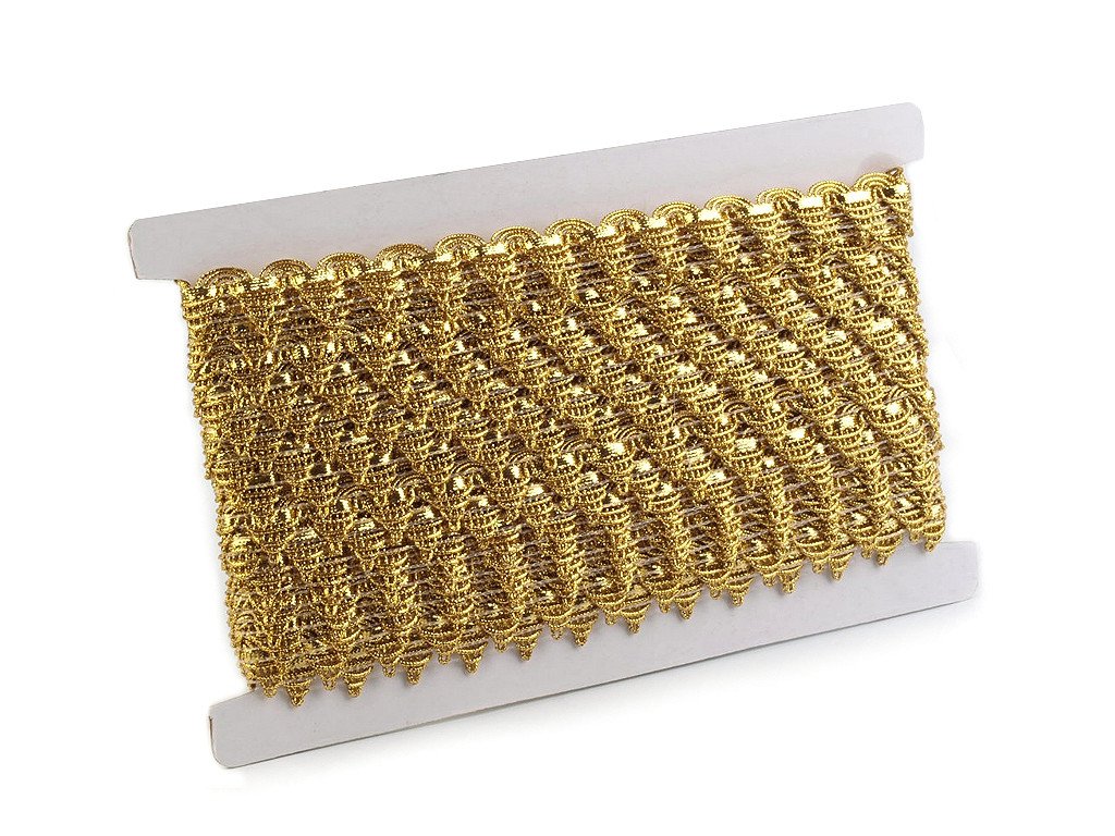 Leonský prýmek zaujme bohatě propracovanými detaily a oslnivým třpytem. Základem je metalická stuha, která je ozdobena protkanými lurexovými šňůrkami a silonovým vláknem, který drží celkový tvar prýmku. Použití: Prýmek využijete jako ozdobu na šaty, sukně, halenky nebo taneční, divadelní a karnevalové kostýmy.- Šíře: 15; 20 mm