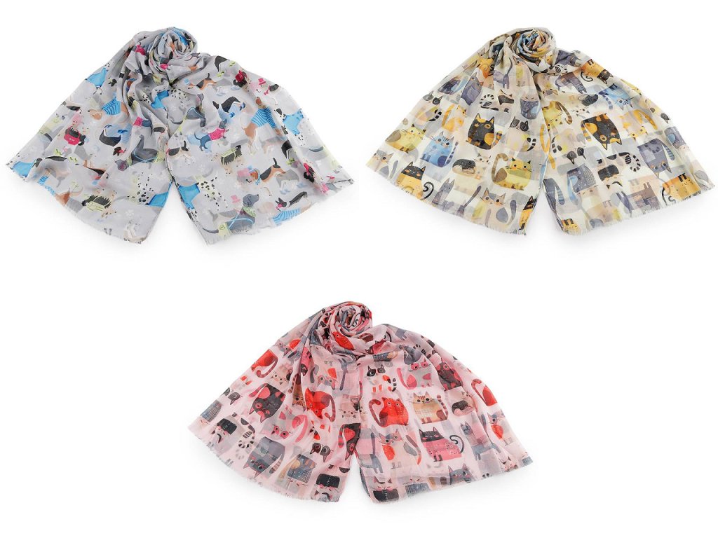 Šátek s motivem psů nebo koček je vzdušný a lehounký, velice příjemný na dotek. Je jemně průsvitný, na koncích má malé třásně. Doladí váš outfit, ať už si vezmete sako, halenku, svetřík či šaty. Šátky mají špatné štítky, skutečné složení je viskóza a polyester. Omlouváme se za toto nedopatření a děkujeme za pochopení.- Šířka: 70 cm