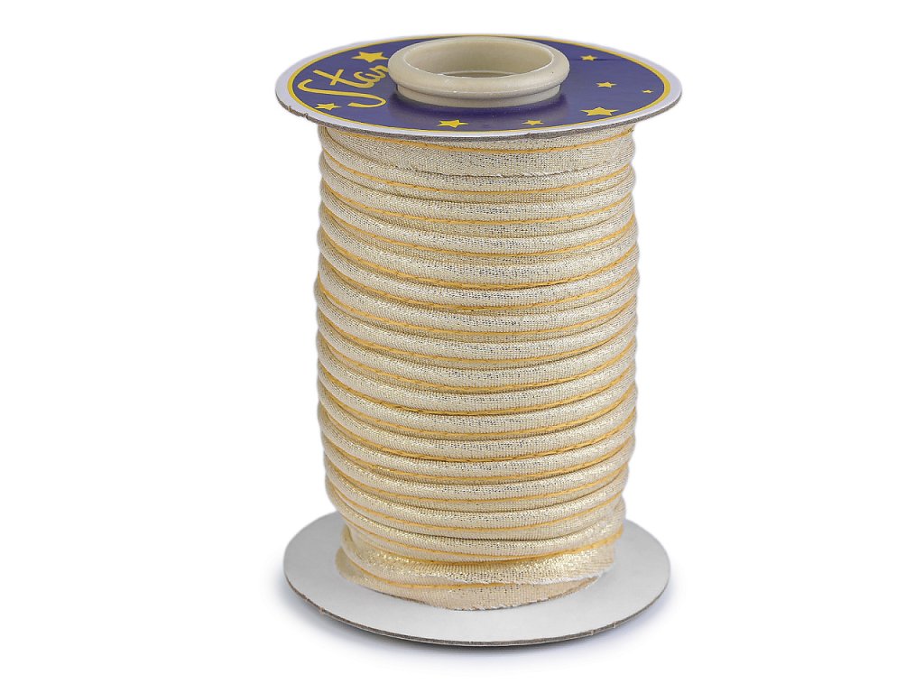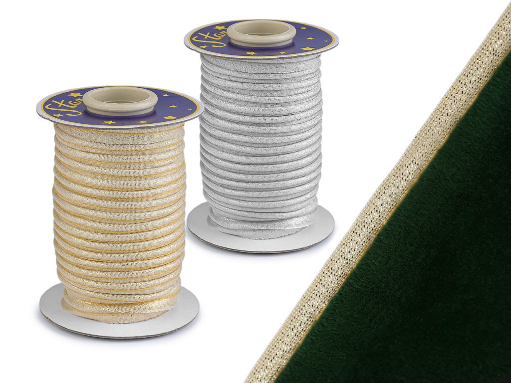 Paspulka s lurexem se poutavě třpytí. Má jeden okraj zesílený, ve vzniklé v dutině je umístěná zakroucená příze. Paspulka má šíři 10 mm. Průměr samotné paspulky, která je po přišití viditelná, je cca 3 mm. Využijete ji k ozdobení lemů či švů, vašemu oděvu dodá nádech elegance. Použití: paspulka vynikne na společenských a plesových šatech, halenkách, sukních, kostýmech i módních doplňcích, jako jsou slavnostní psaníčka, peněženky, obuv apod. Je vhodná i na olemování bytového textilu - ubrusů, deček, polštářů apod.- Šíře: 10 mm