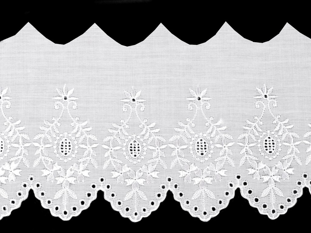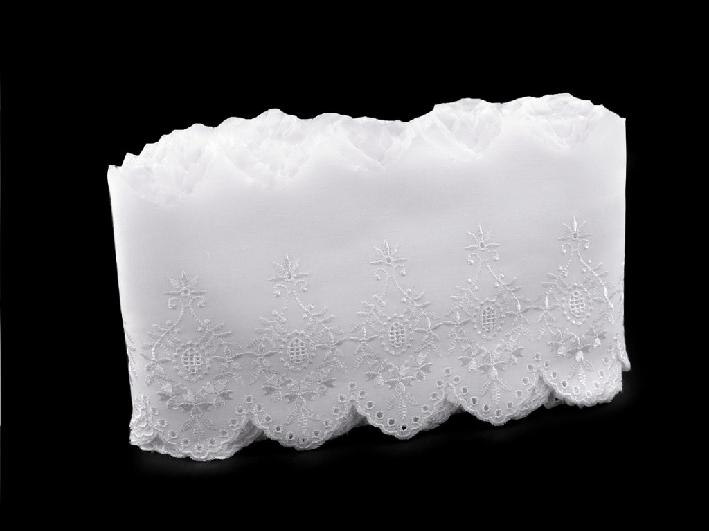 Madeirou, s dírkovanou výšivkou, můžete ozdobit oblečení (šaty, halenky, lehké sukně). Často se používá i jako dekorace bytového textilu například polštářů, povlečení, deček, ubrusů či kuchyňských záclonek. Šíře nevyšité části se může mírně lišit (±10%).- Šíře: 15 cm