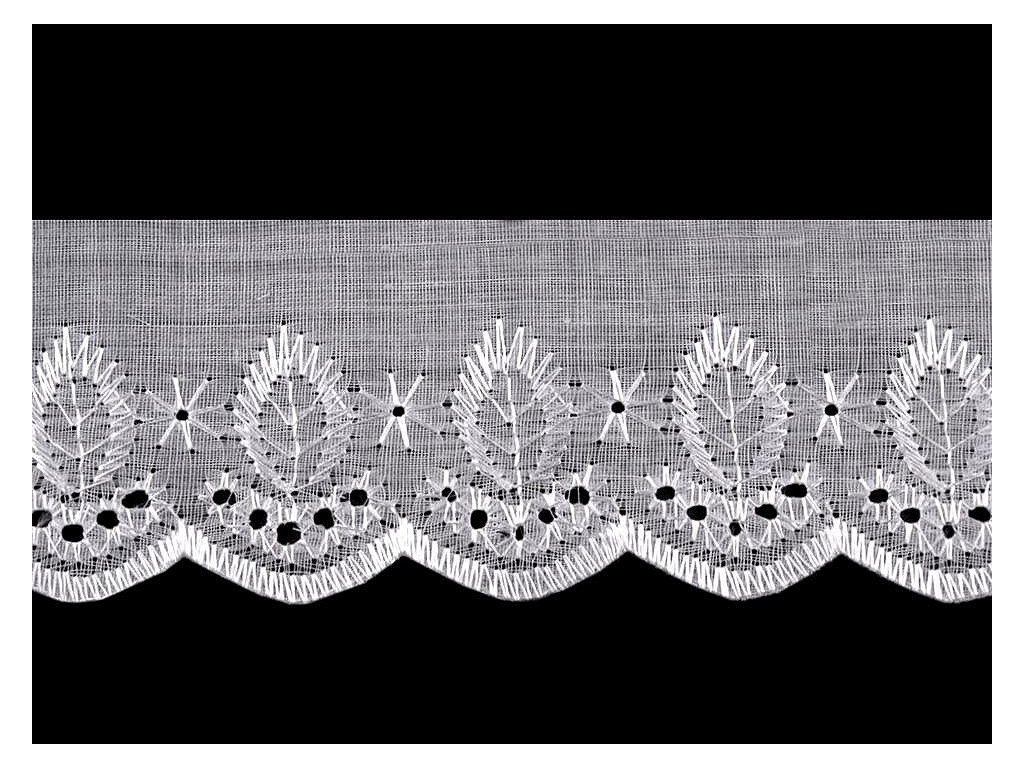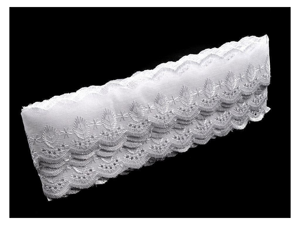 Madeiru zdobí typický vzor s dírkovou výšivkou, která se leskne. Okraj je tvořený z oblouků. Použití: Madeirou můžete ozdobit oblečení (šaty, halenky, lehké sukně a prádlo). Často se používá i jako dekorace bytového textilu například polštářů, povlečení, deček, ubrusů, kuchyňských záclonek nebo dětských zavinovaček. Šíře nevyšité části se může mírně lišit (±10%).- Šíře: 50 mm