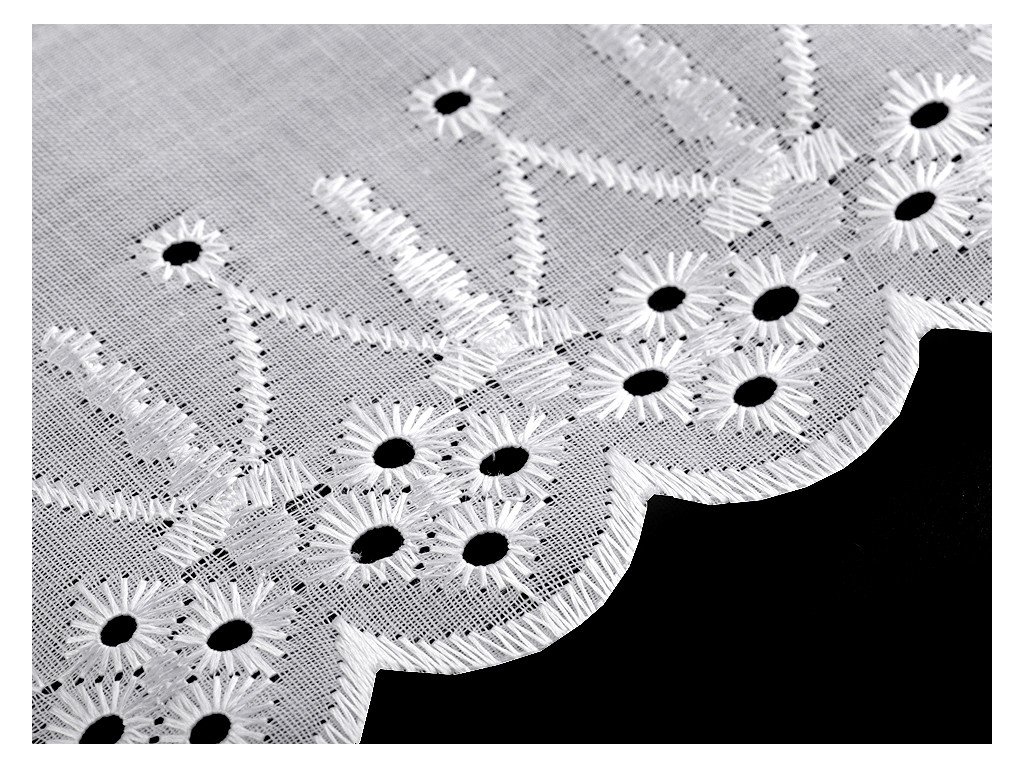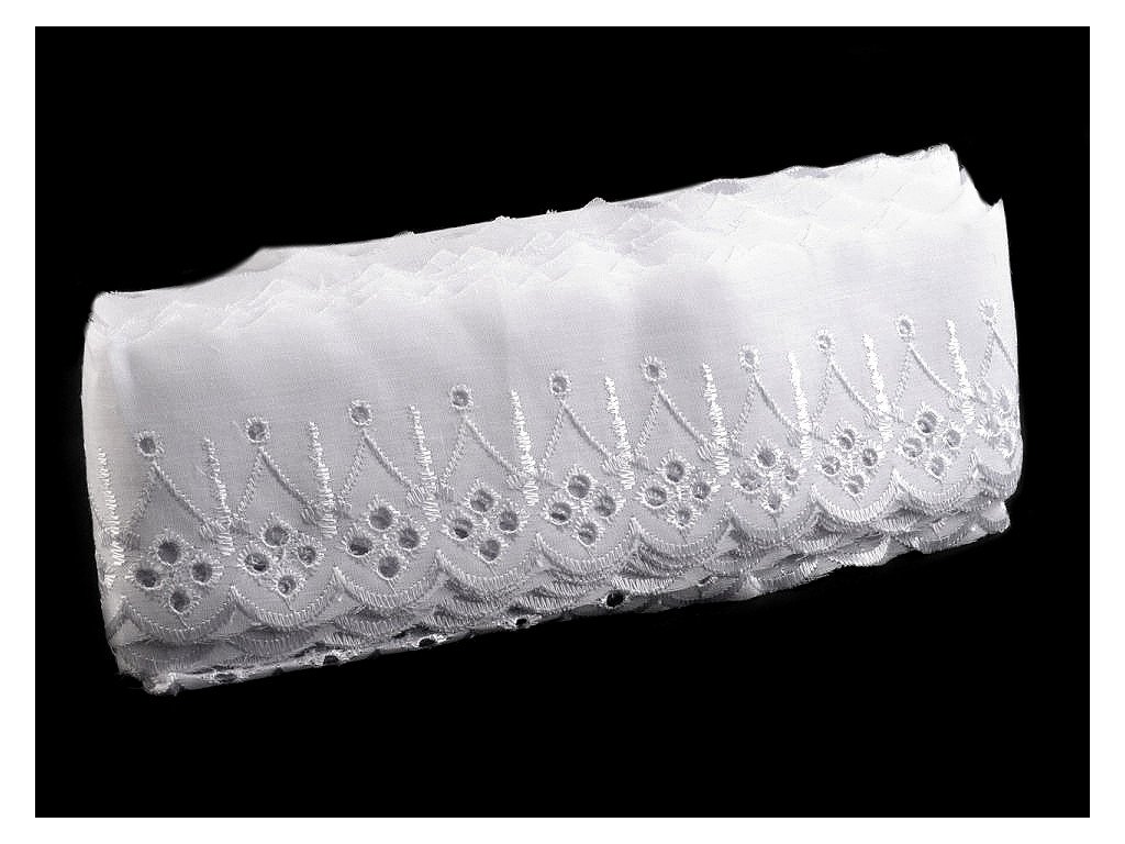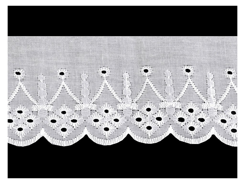 Madeira s moderním vzorem je typická svou dírkovou výšivkou, která se leskne. Použití: Madeiru využijete na ozdobení oděvů i bytového textilu, například polštářů, povlečení, ubrusů, záclonek apod. Je vhodná také jako ozdoba dětských zavinovaček. Šíře nevyšité části se může mírně lišit (±10%).- Šíře: 75 mm