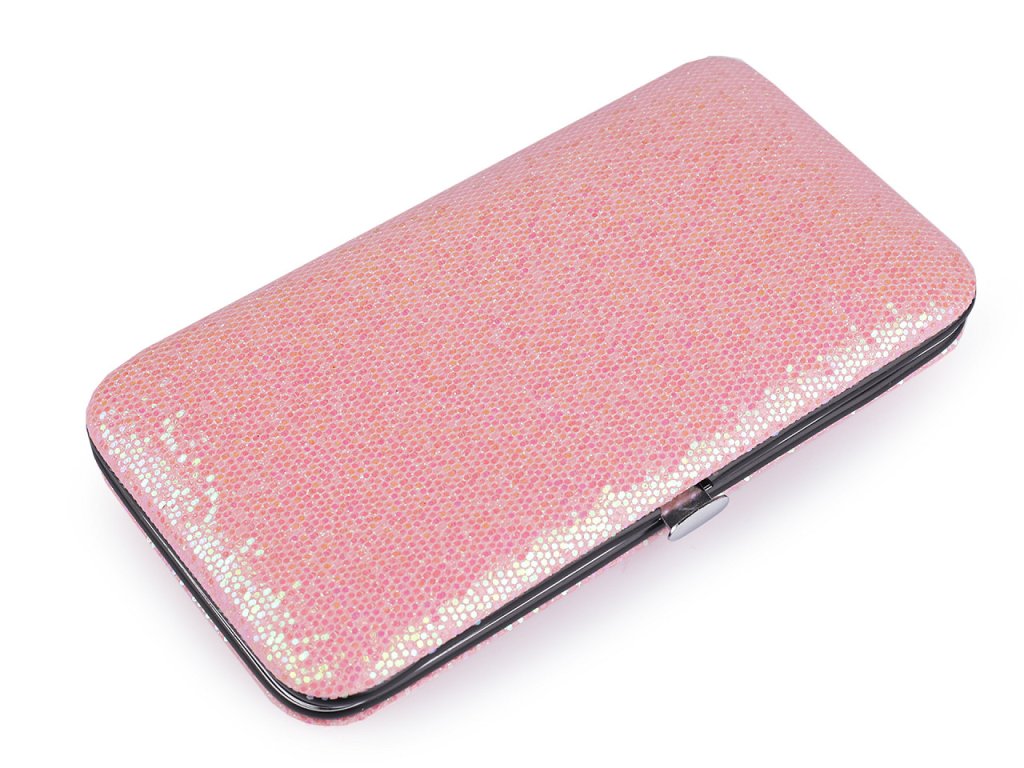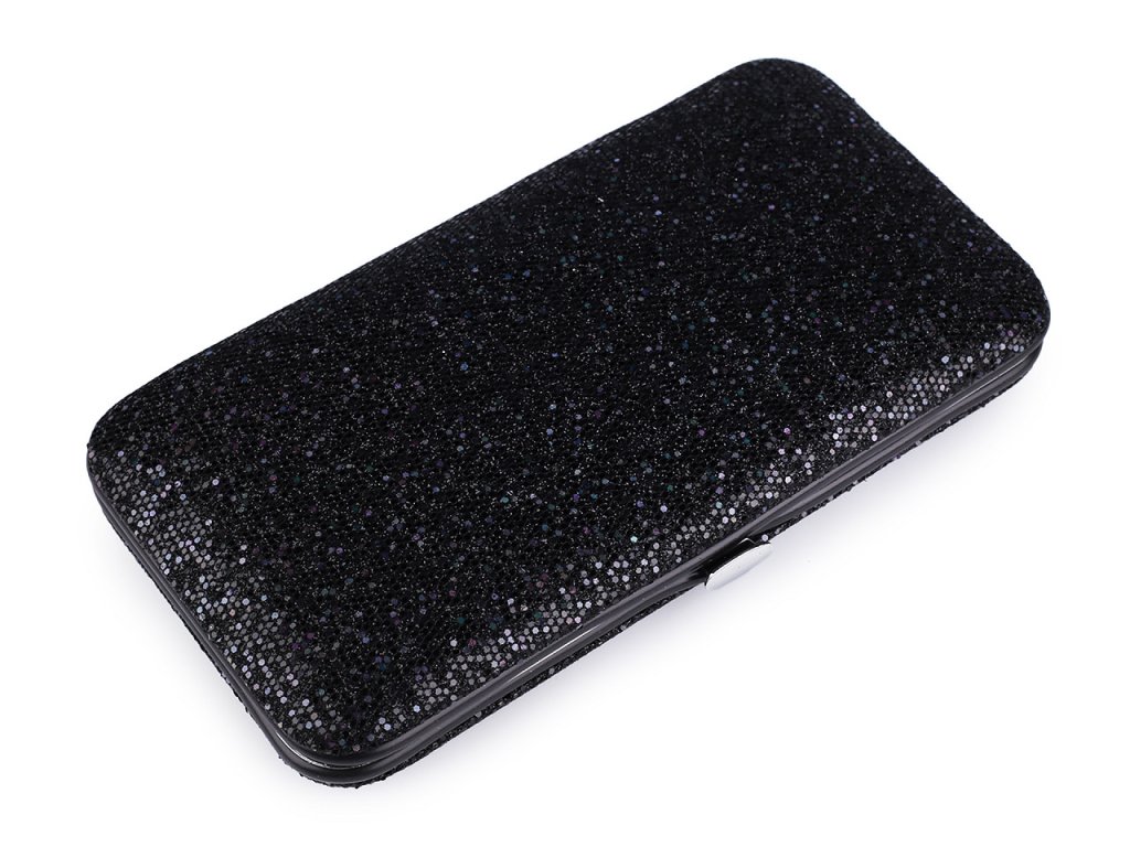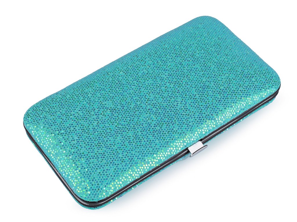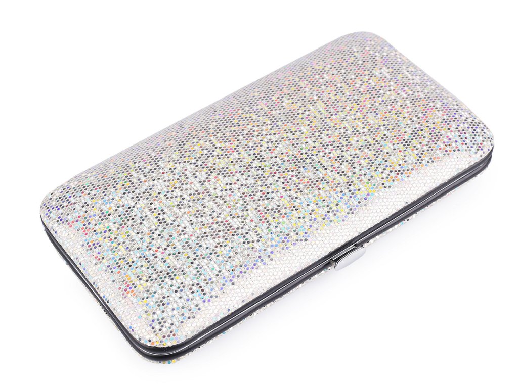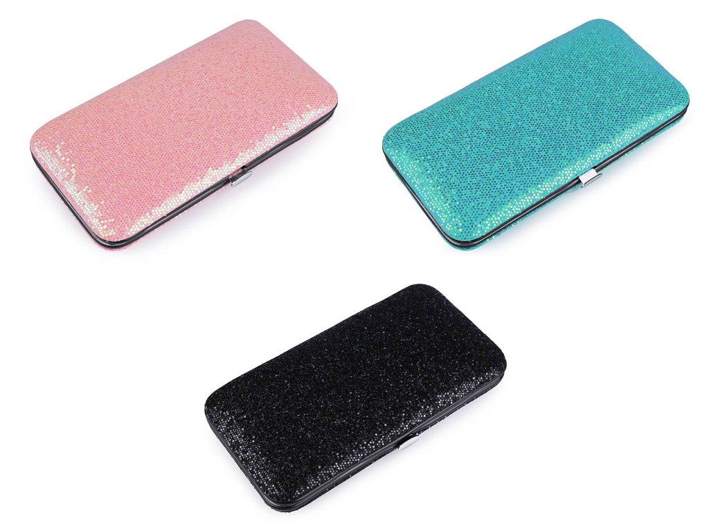 Manikúra v pouzdře potěší každou ženu či dívku. Její luxusní pouzdro s glitry se velice poutavě třpytí. Pouzdro má kvalitní kovový rám, který jednoduše otevřete stisknutím páčky a zavřete zaklapnutím. Povrch je kvalitní, glitry se neodírají. Manikúra je praktická, pohodlně se vejde do kabelky, je vhodná i na cestování. Manikúra obsahuje: nehtové nůžky, pilník, pinzetu, 5 kusů manikúrových nástrojů a 4 kusy nehtových kleští.- Šířka: 8 cm
