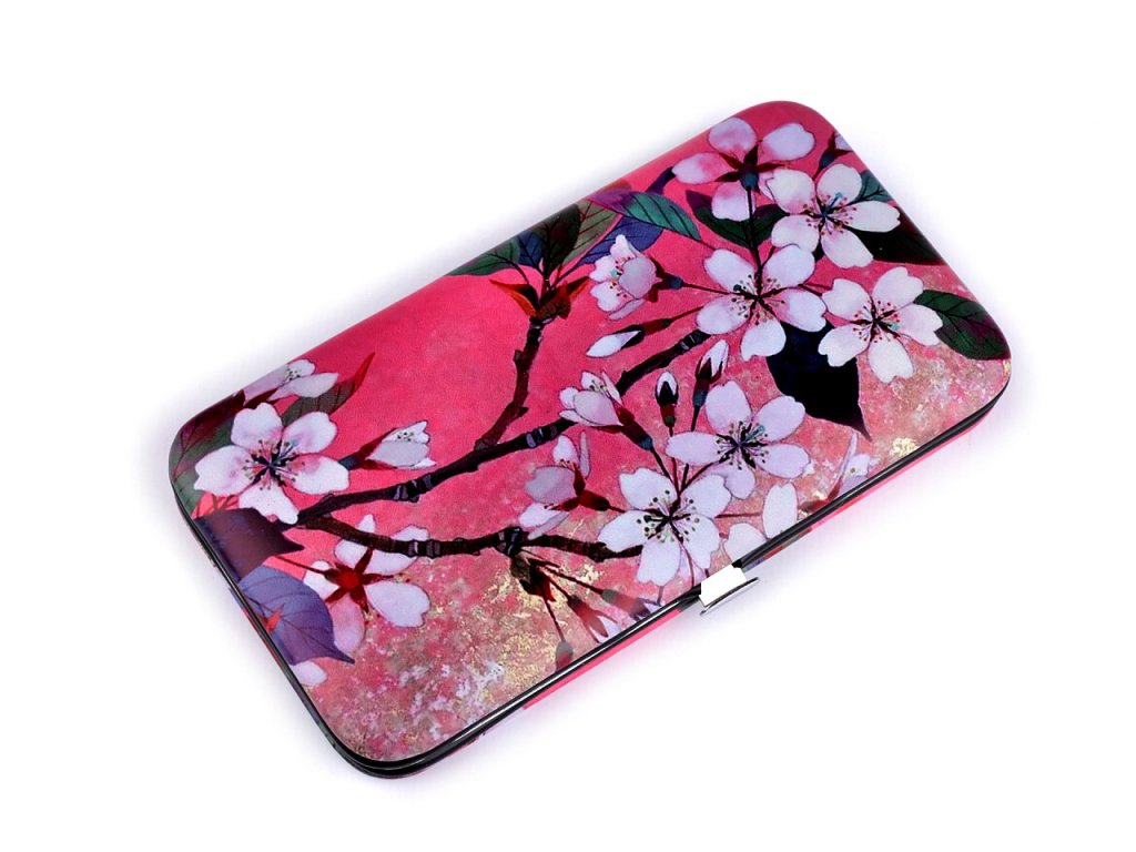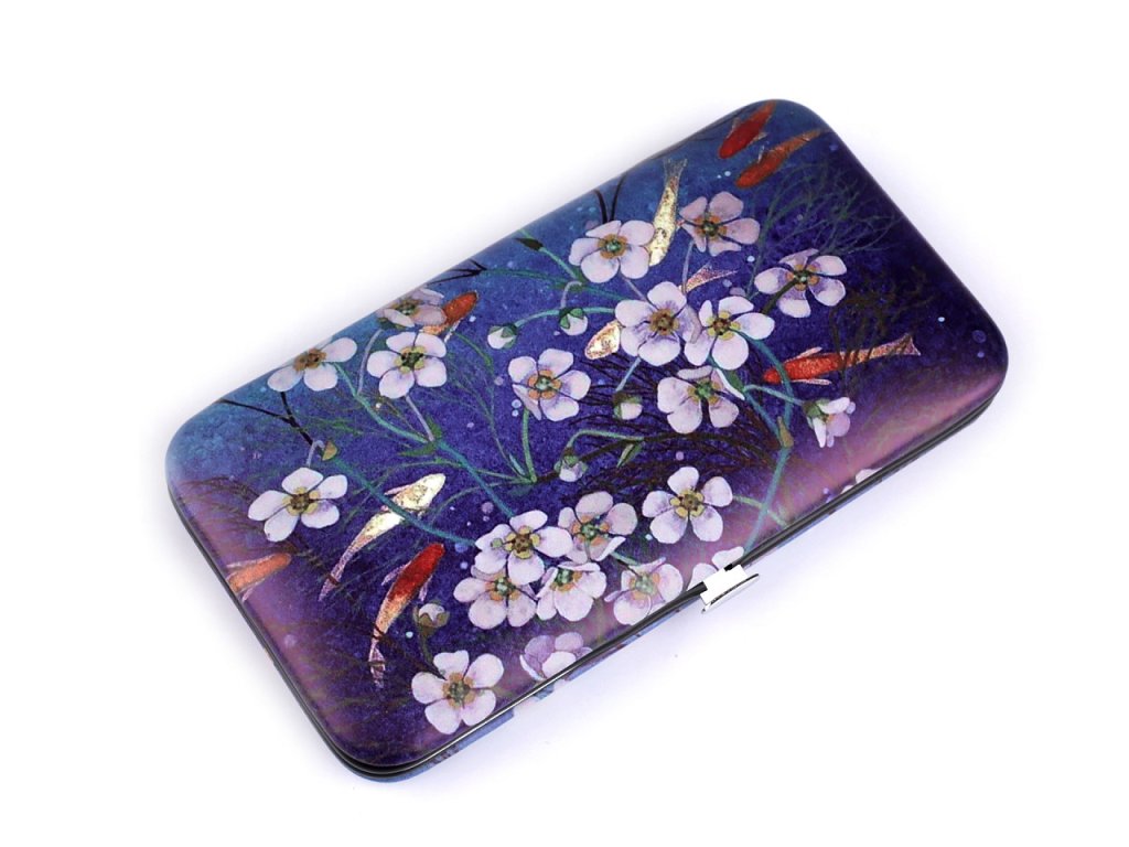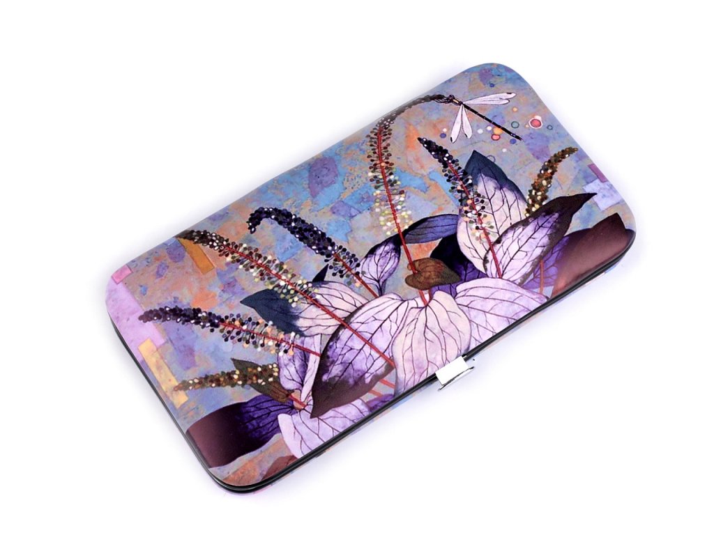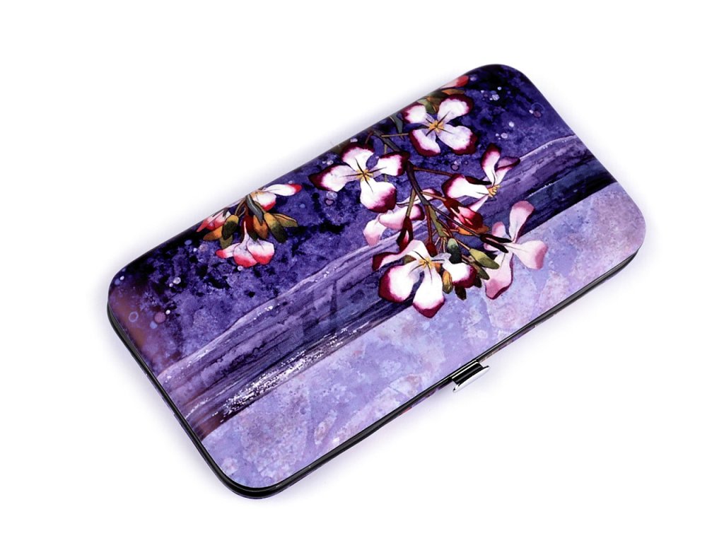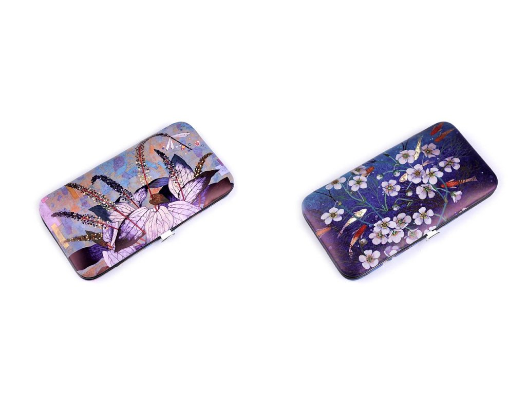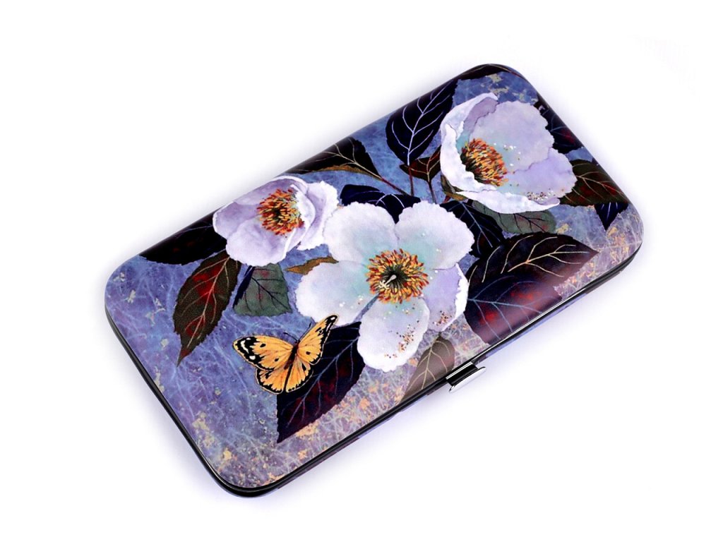Manikúra v pouzdře s květinovým potiskem potěší každou ženu či dívku. Pouzdro má kvalitní kovový rám, který jednoduše otevřete stisknutím páčky a zavřete zaklapnutím. Povrch pouzdra je z eko kůže. Manikúra je praktická, pohodlně se vejde do kabelky, je vhodná i na cestování. Manikúra obsahuje: nehtové nůžky, pilník, pinzetu, 5 kusů manikúrových nástrojů a 4 kusy nehtových kleští.- Šířka: 8 cm