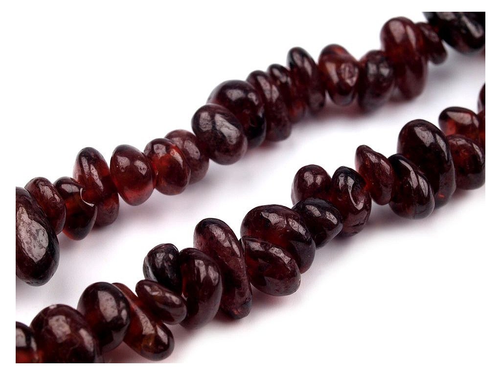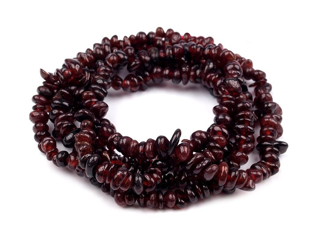 Zlomky přírodních minerálů - to jsou jedny z nejvariabilnějších bižuterních prvků. Jsou zajímavé kresbou kamene a půvabné svým průsvitem. Tyto korálky jsou jedním z našich hitů, což je dáno jejich kvalitou, a velmi příznivou cenou. Jsou vhodné k výrobě náušnic, náramků, náhrdelníků a také motanic. Můžete je navléci na lanko nebo na ketlovací jehlu a pak zavěsit na řetízek. Zlomky granátu jsou navlečené na dvojité polyesterové niti.- Délka: 88 - 90 cm