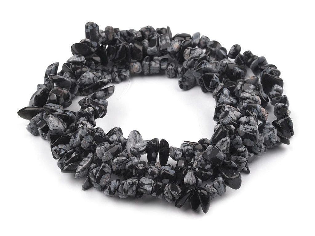 Zlomky přírodních minerálů jsou jedny z nejvariabilnějších bižuterních prvků. Vločkové obsidiány jsou jedinečné svou kresbou. Tyto korálky jsou jedním z našich hitů, což je dáno jejich kvalitou a velmi příznivou cenou. Na jedné šňůře je cca 230 zlomků. Dají se kombinovat s různými materiály jako je sklo, plast, dřevo, kov, aj. Zlomky můžete navléci na lanko nebo na ketlovací jehlu a pak zavěsit na řetízek.- Délka: 85 cm