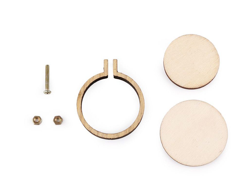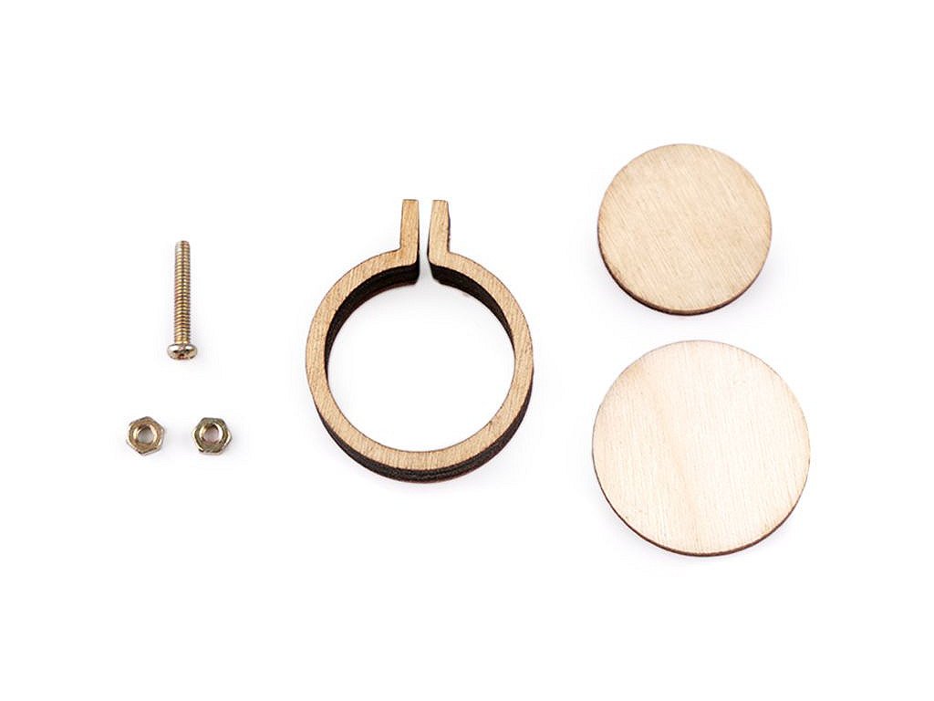Malý dřevěný rámeček je vhodný na tvoření drobných vyšívaných obrázků. Hotové obrázky v rámečku můžete nosit jako přívěsek na krku nebo s nimi můžete ozdobit dárky apod. Vyšitý obrázek nalepte na menší destičku, větší destičku nalepte ze zadní strany rámečku a vložte do rámečku menší destičku s obrázkem. Rámeček v horní části utáhněte přiloženým šroubkem a maticemi.- Vnější průměr: č. 1: 24 mm